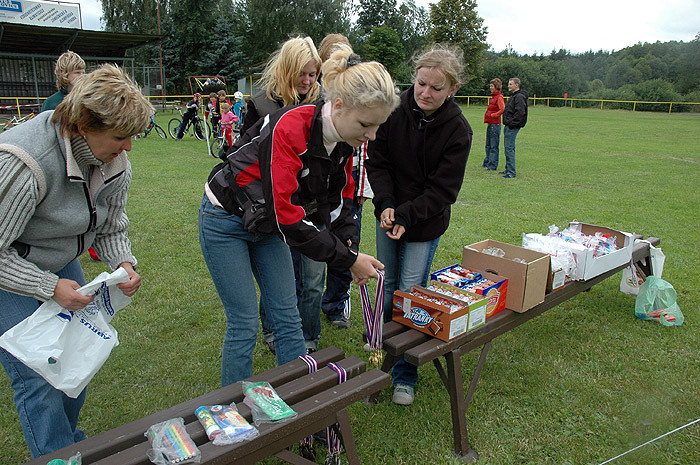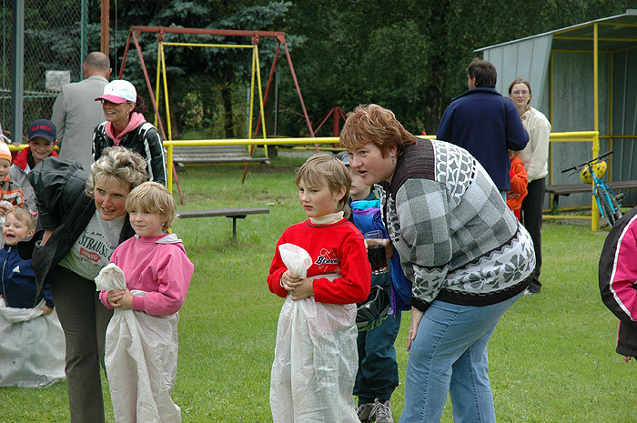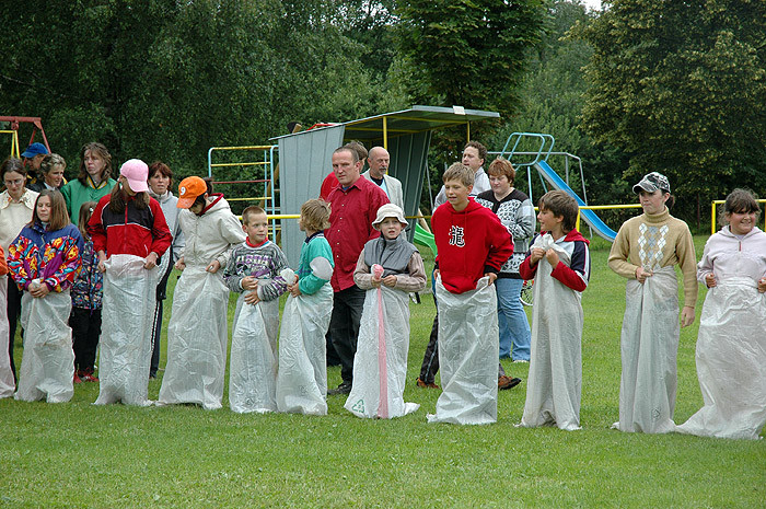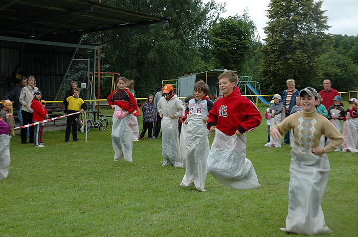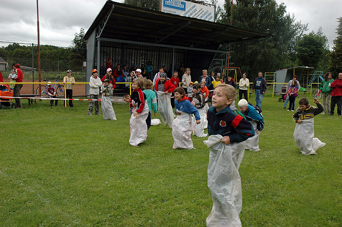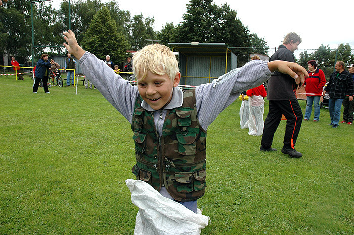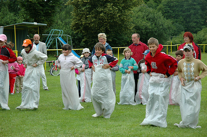 Skákání v pytli, hod míčkem na plechovky, jízda zručnosti na kole, běh kolem hřiště, kop míčem na cíl, stříkání vody na cíl - soutěžili i rodiče. Doplňkové hry - nafukování balonků, běh s balonkem mezi nohama, pojídání koláče se zapečenou pětikorunou. Dále střelba na běžící prase a jízda na motorových čtyřkolkách. Všechny děti dostali za své výkony sladké odměny.
