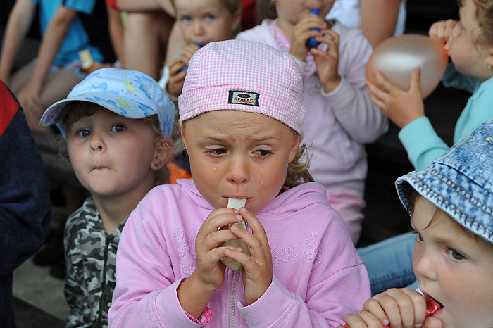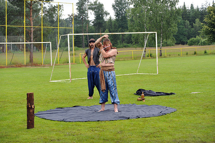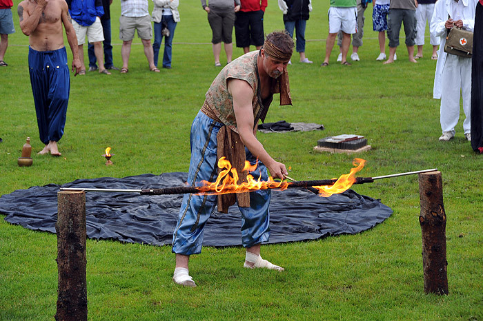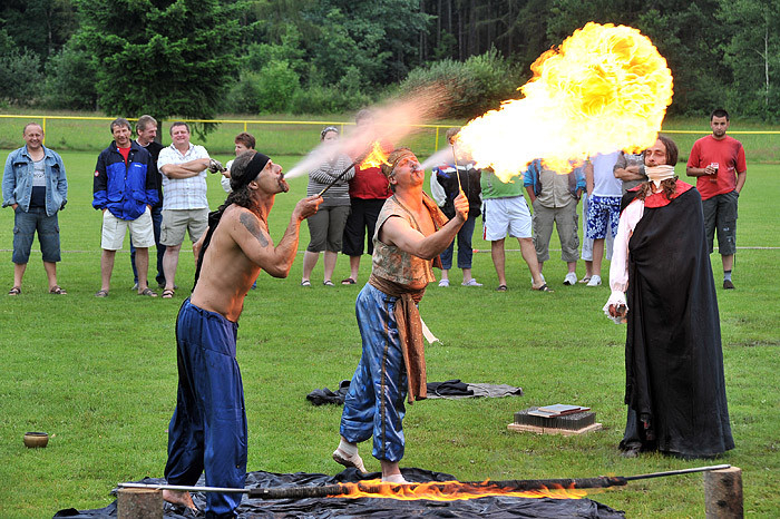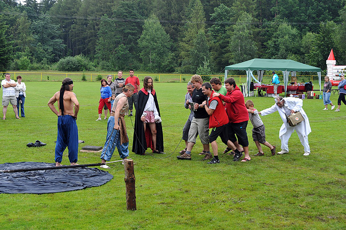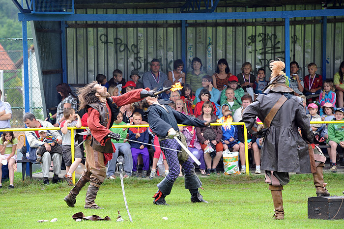 Celé odpoledne děti dováděly ve skákacím hradu, nafukovaly balónky, dokonce je i plnily vodou a ten, kdo nezmokl, stal se jejich cílem. No bylo nám všem docela mokro a chladno. Mezi soutěžemi vystoupila dvakrát skupina historického šermu. Nejprve dětem a ostatním ukázali trochu šermířského umění, poté kejklířské kousky. V druhém vystoupení dokonce došlo na oheň a chůzi po hřebíkové podložce, dokonce se zapojením diváků. Všichni jsme se vrátili o několik set let zpátky a bylo to fajn. Diváci chvílemi ani nedýchali.
