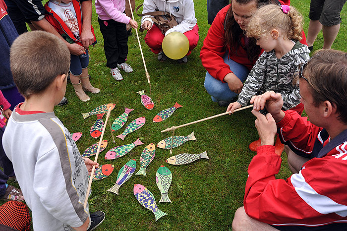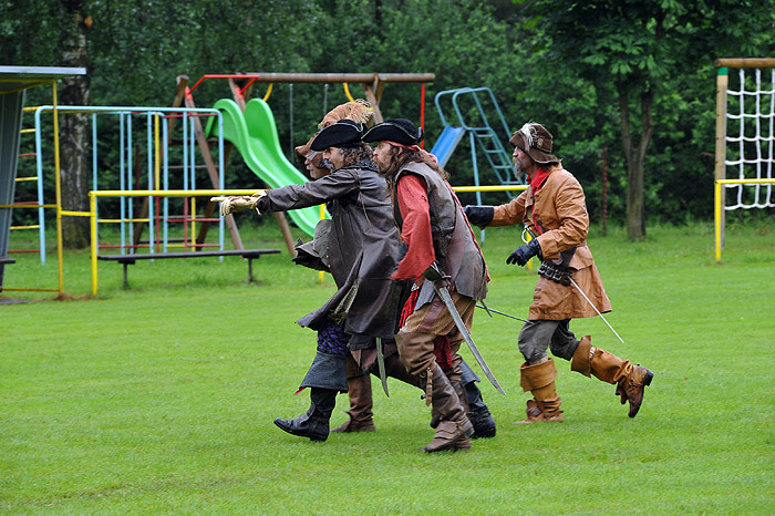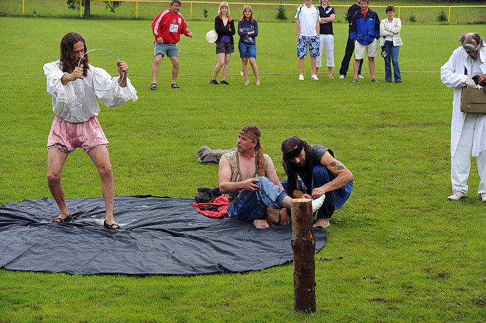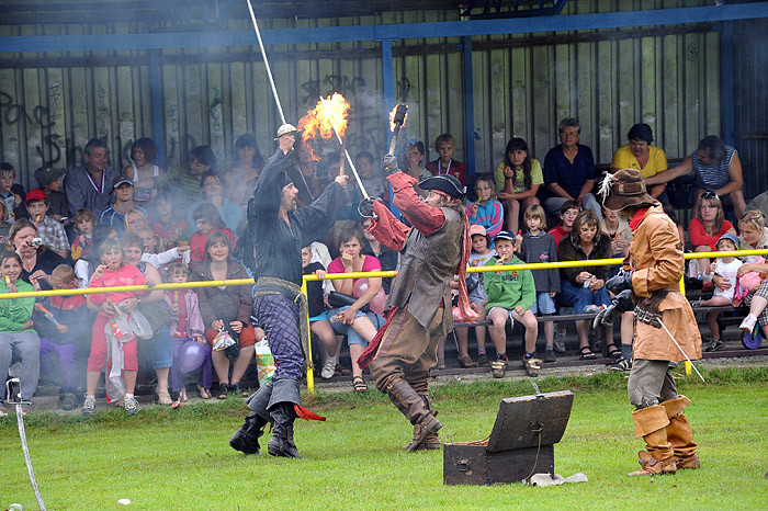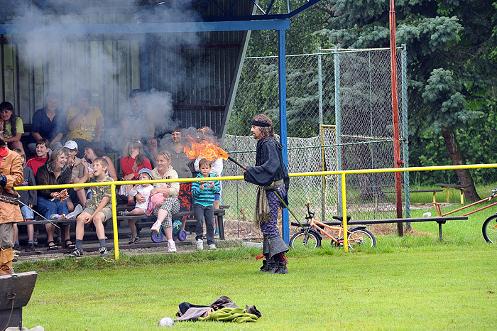 Celé odpoledne děti dováděly ve skákacím hradu, nafukovaly balónky, dokonce je i plnily vodou a ten, kdo nezmokl, stal se jejich cílem. No bylo nám všem docela mokro a chladno. Mezi soutěžemi vystoupila dvakrát skupina historického šermu. Nejprve dětem a ostatním ukázali trochu šermířského umění, poté kejklířské kousky. V druhém vystoupení dokonce došlo na oheň a chůzi po hřebíkové podložce, dokonce se zapojením diváků. Všichni jsme se vrátili o několik set let zpátky a bylo to fajn. Diváci chvílemi ani nedýchali.