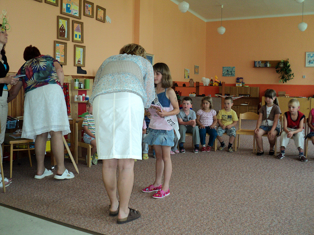 Děti dostaly pohádkovou knížku, balíček výtv. pomůcek do školy a fotoalbum s fotkami, které zachycovaly dění ve školce od nástupu dítěte až do jeho rozloučení se školkou. Na závěr se s dětmi rozloučila i p. starostka E. Kubová a všem dětem předala drobné dárky, předškoláci dostali pomůcky do školy. Na úspěchy ve škole si děti připily dětským šampaňským.