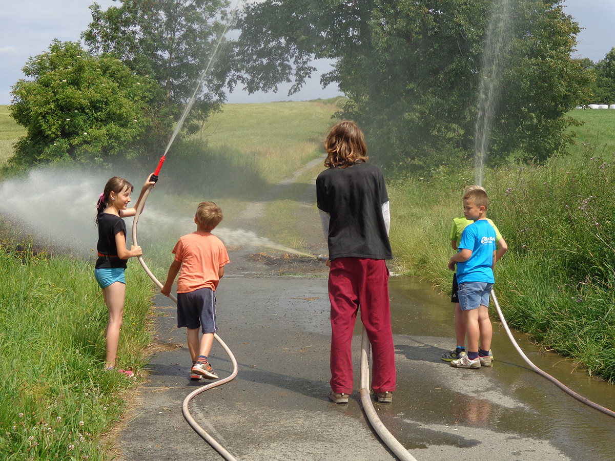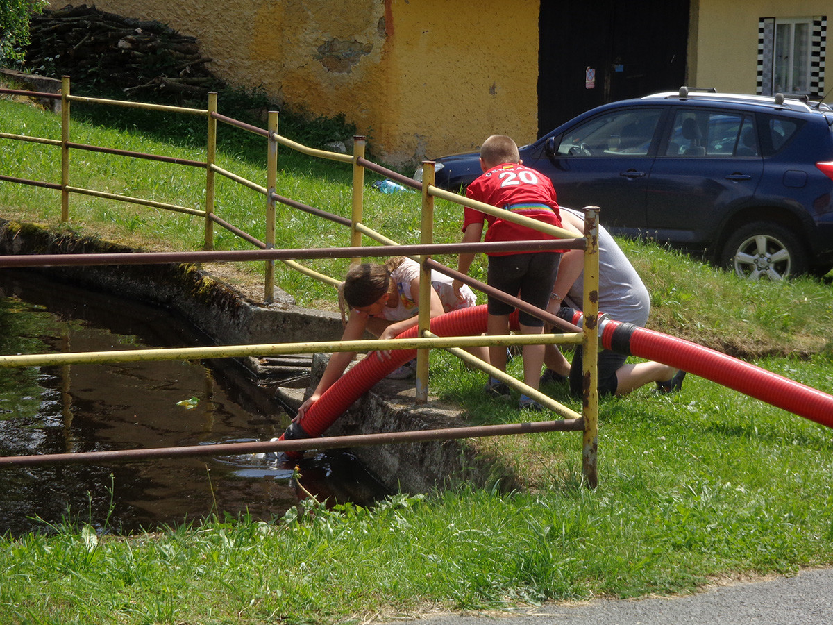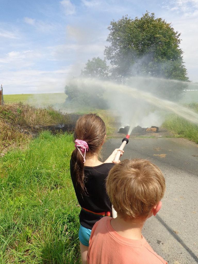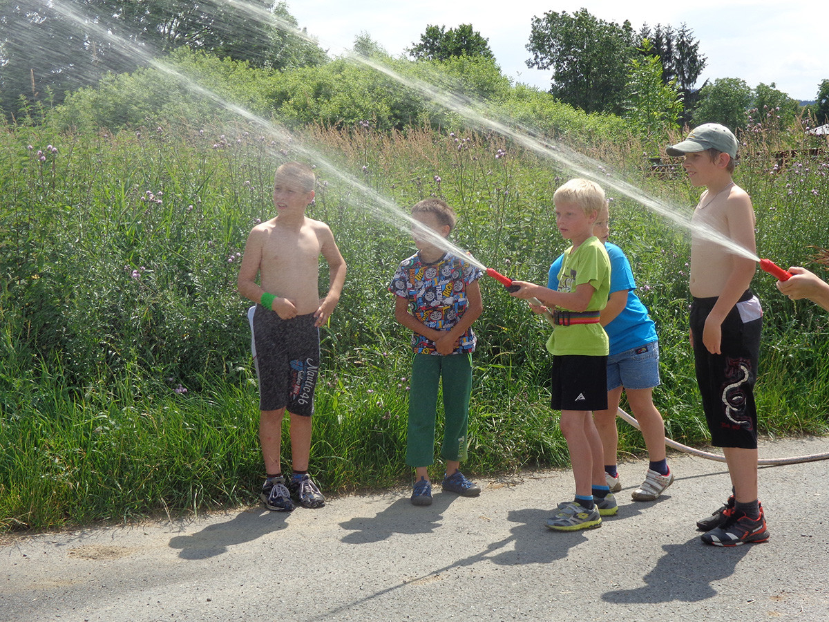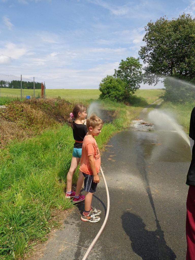 Hadice smotali dospěláci a na startu už bylo připravené druhé družstvo – mladší děti. I pro ně byl připraven balík slámy a pro zlepšení atmosféry se pro ně zapálila i trocha trávy. Ve tvářích všech dětí bylo vidět nadšení i napětí. Nakonec kvůli provětrání nejnovějšího člena mužského družstva byl připojen ještě třetí proud. Balík i trávu uhasily do posledního stébélka a děti neopomenuly napodobit starší tým a také se navzájem postříkaly.