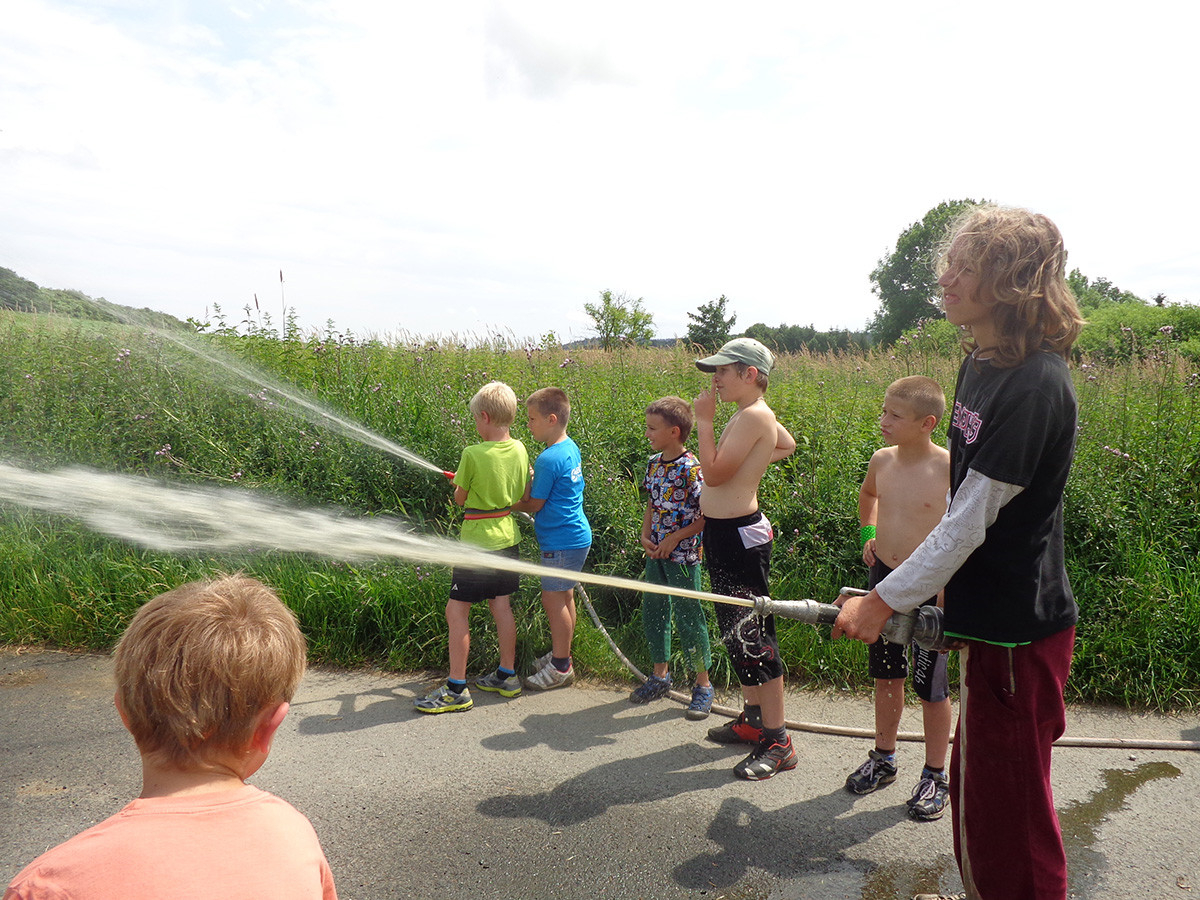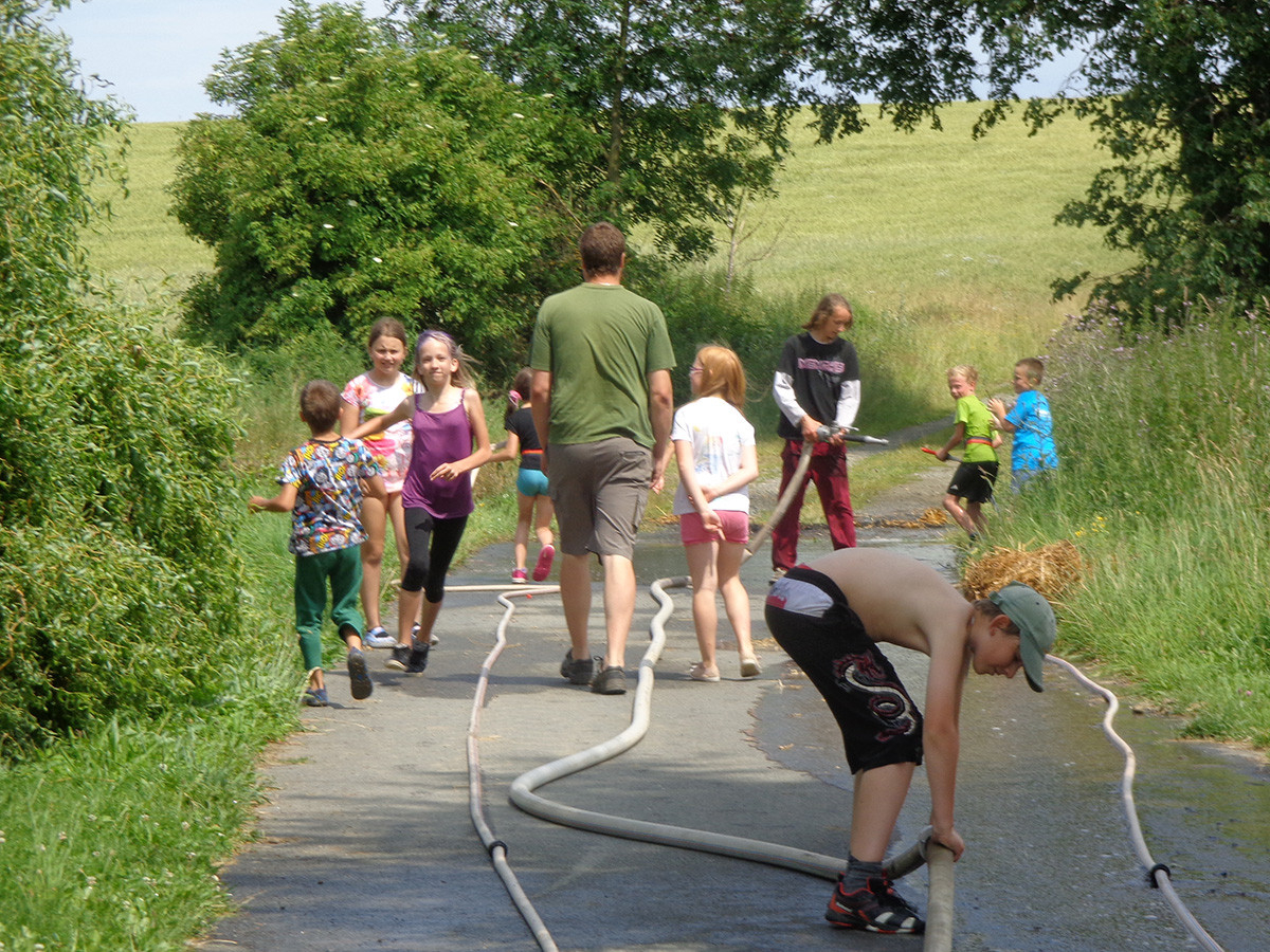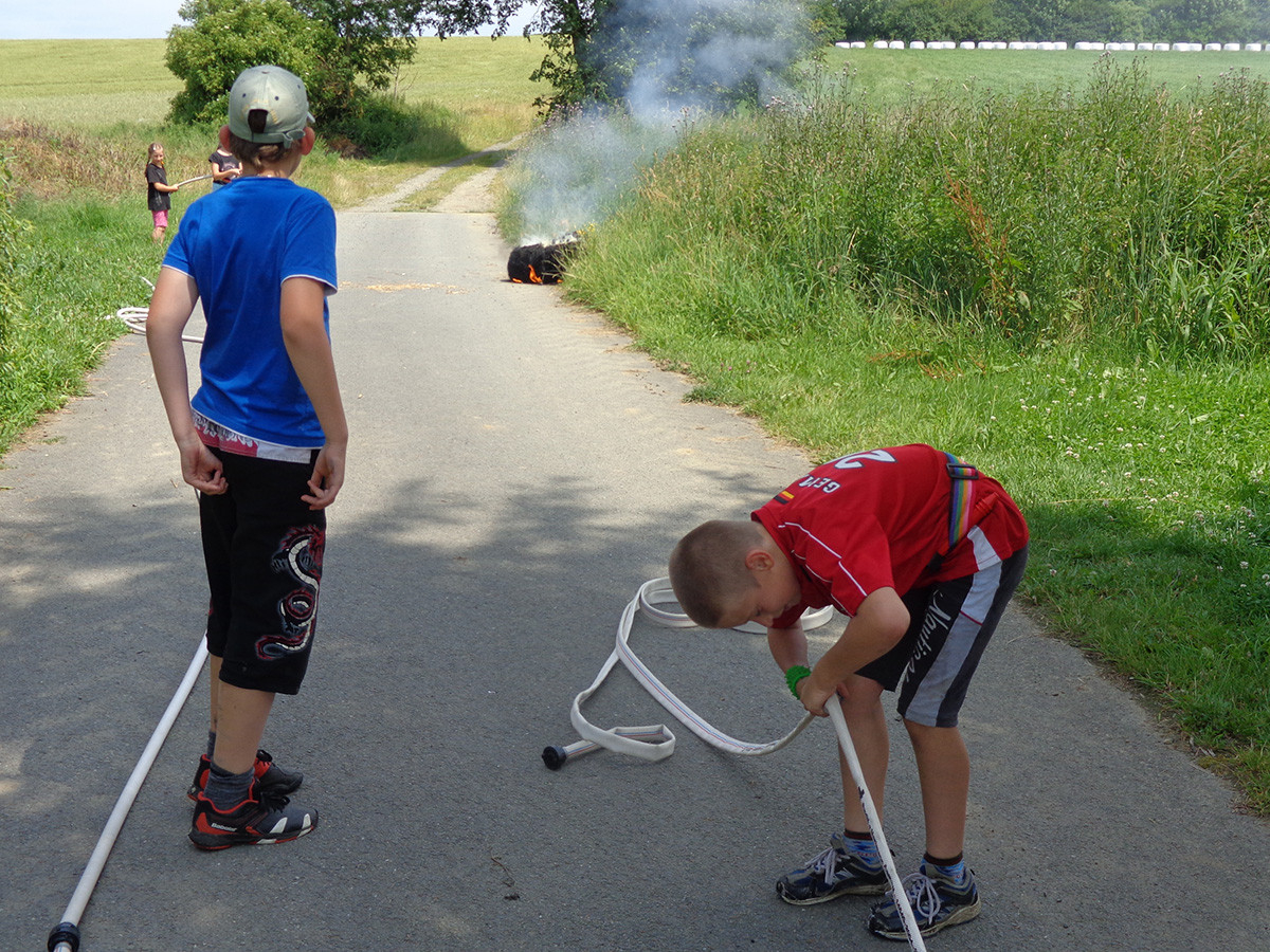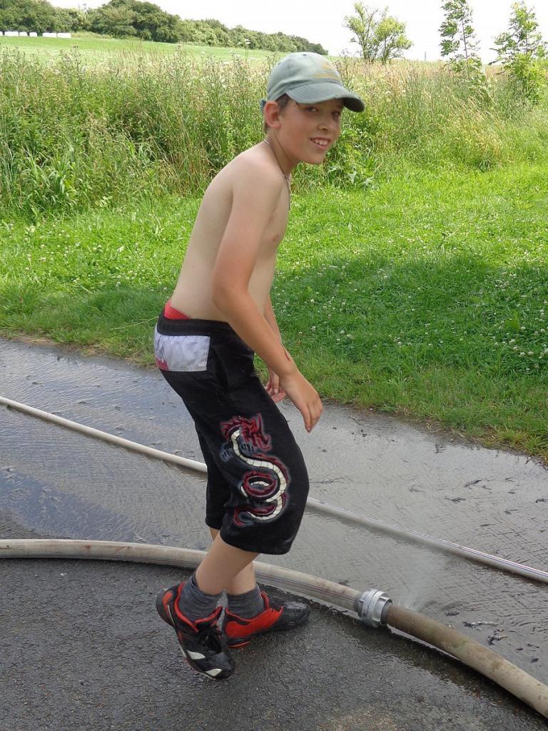 Hadice smotali dospěláci a na startu už bylo připravené druhé družstvo – mladší děti. I pro ně byl připraven balík slámy a pro zlepšení atmosféry se pro ně zapálila i trocha trávy. Ve tvářích všech dětí bylo vidět nadšení i napětí. Nakonec kvůli provětrání nejnovějšího člena mužského družstva byl připojen ještě třetí proud. Balík i trávu uhasily do posledního stébélka a děti neopomenuly napodobit starší tým a také se navzájem postříkaly.