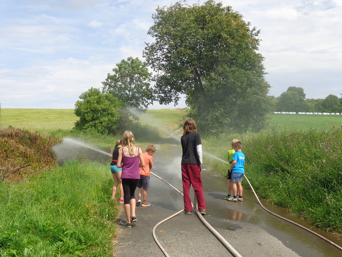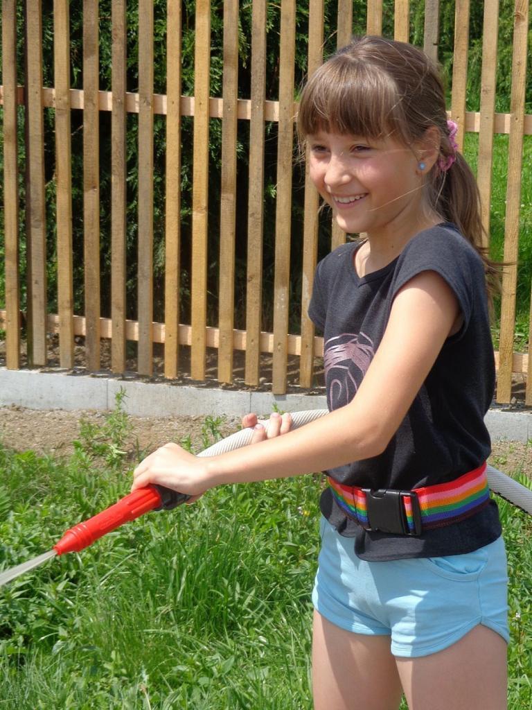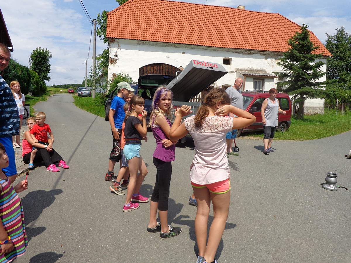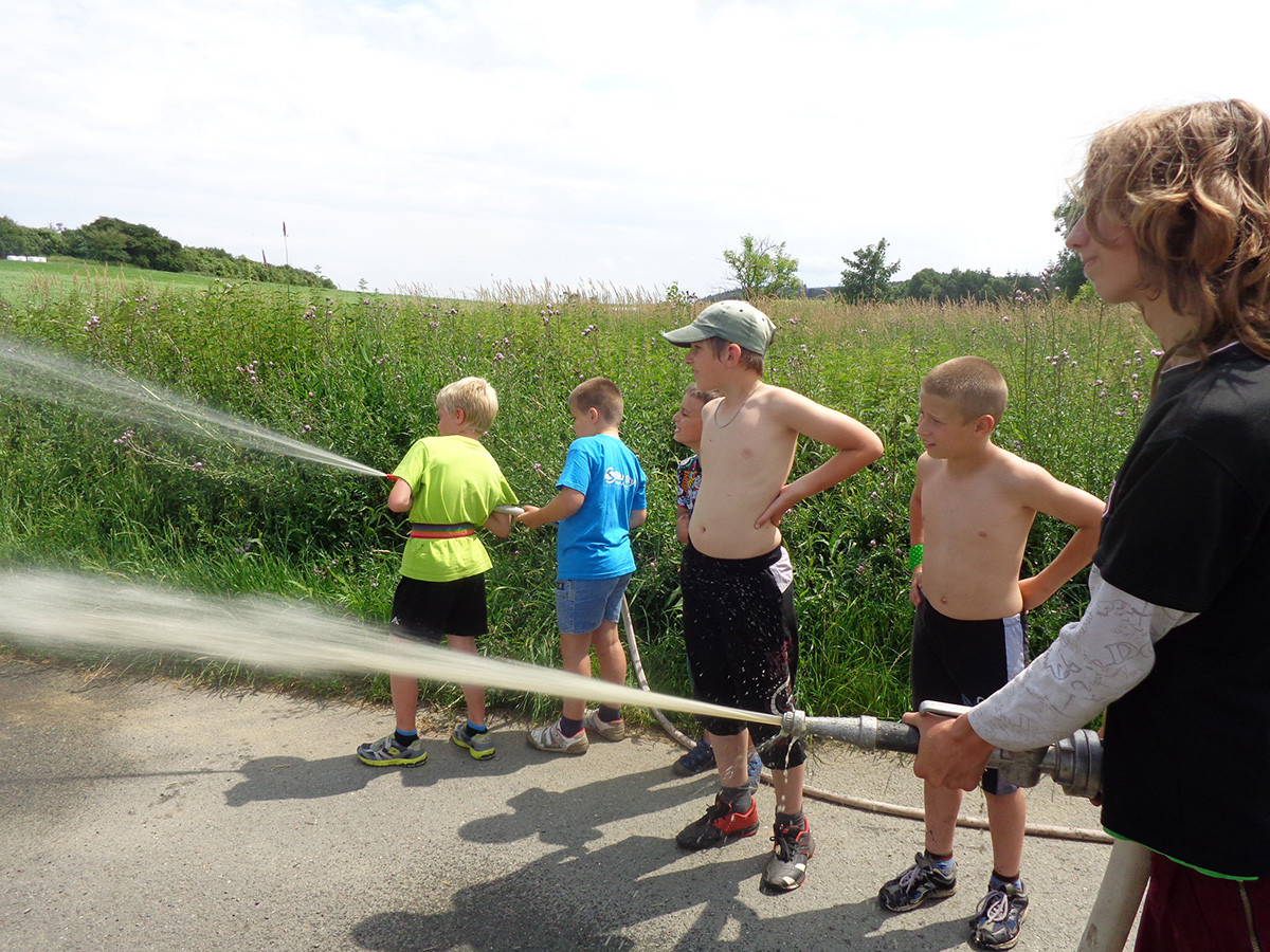 Hadice smotali dospěláci a na startu už bylo připravené druhé družstvo – mladší děti. I pro ně byl připraven balík slámy a pro zlepšení atmosféry se pro ně zapálila i trocha trávy. Ve tvářích všech dětí bylo vidět nadšení i napětí. Nakonec kvůli provětrání nejnovějšího člena mužského družstva byl připojen ještě třetí proud. Balík i trávu uhasily do posledního stébélka a děti neopomenuly napodobit starší tým a také se navzájem postříkaly.