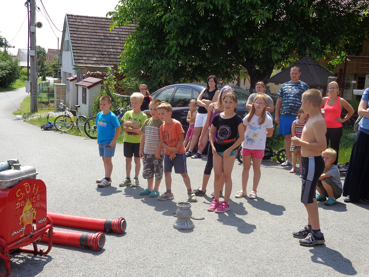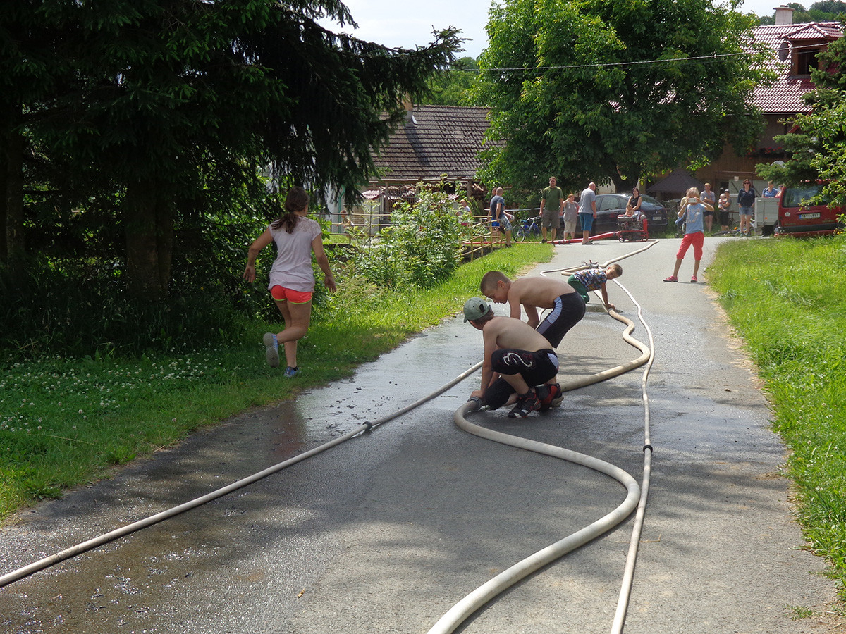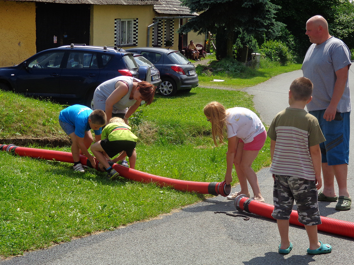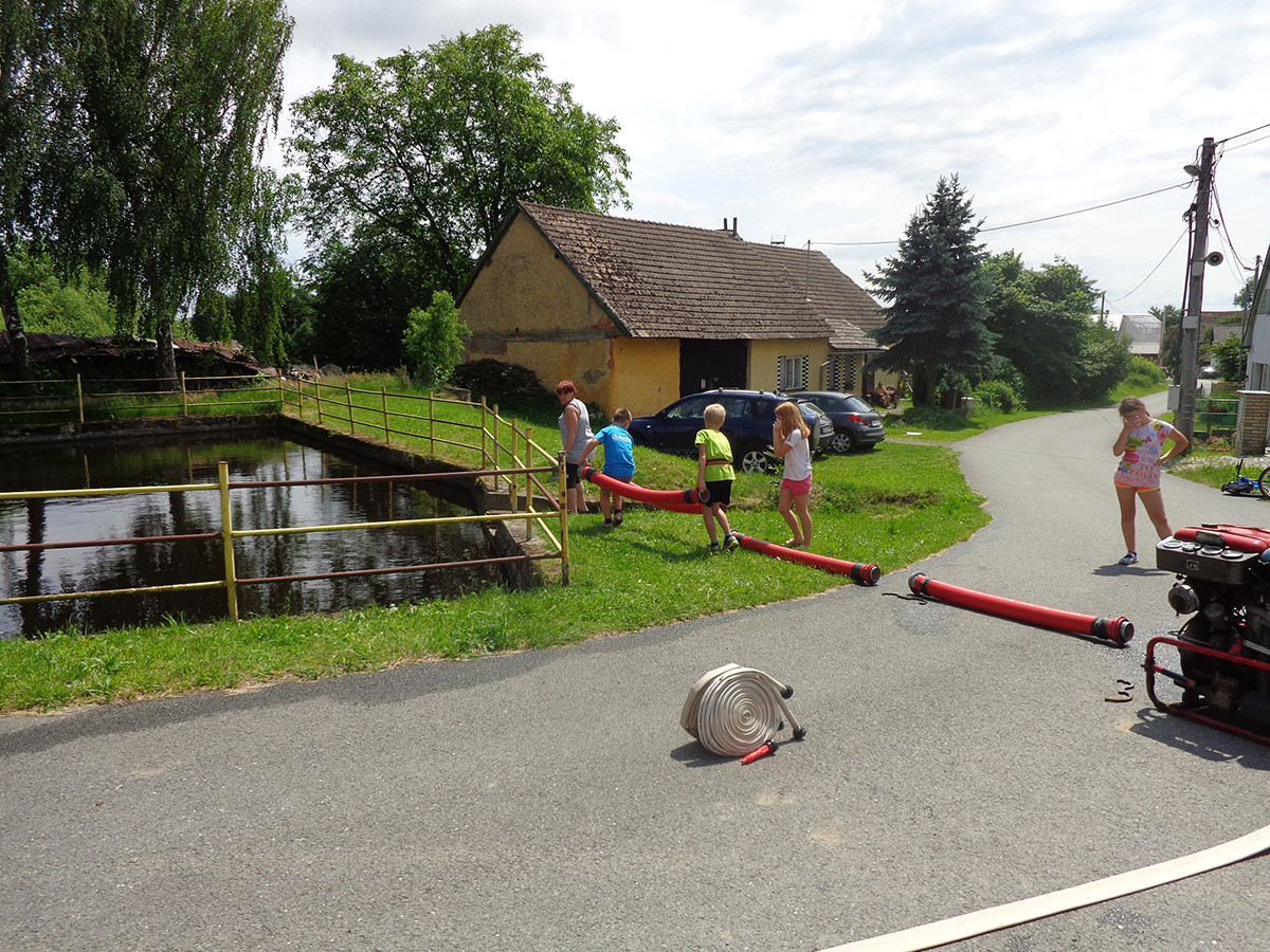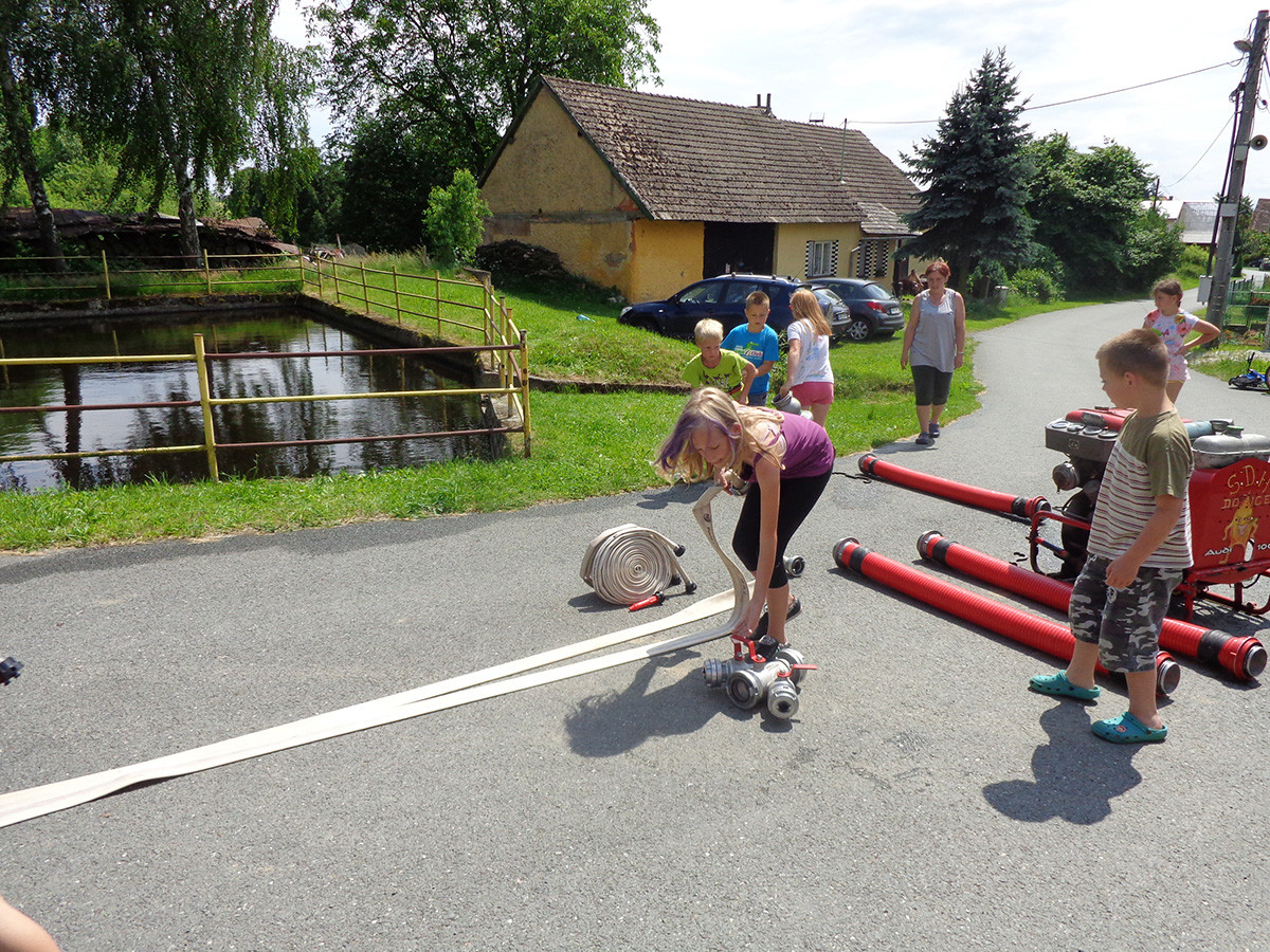 Úderem 14. hodiny už zde netrpělivě postávala obě družstva dětí, dospělí hasiči jim připravovali základnu a pyšné maminky netrpělivě sledovaly své ratolesti. Odstartováno bylo sirénou a po jejím doznění vyběhlo nejdříve družstvo starších dětí. Jejich úkol byl jasný, uhasit hořící balík slámy. Děti předvedly výborný útok, plameny z hořícího balíku byly uhašeny během chvilky. V zápalu boje pak začaly stříkat po sobě navzájem, což je očividně bavilo ještě více.