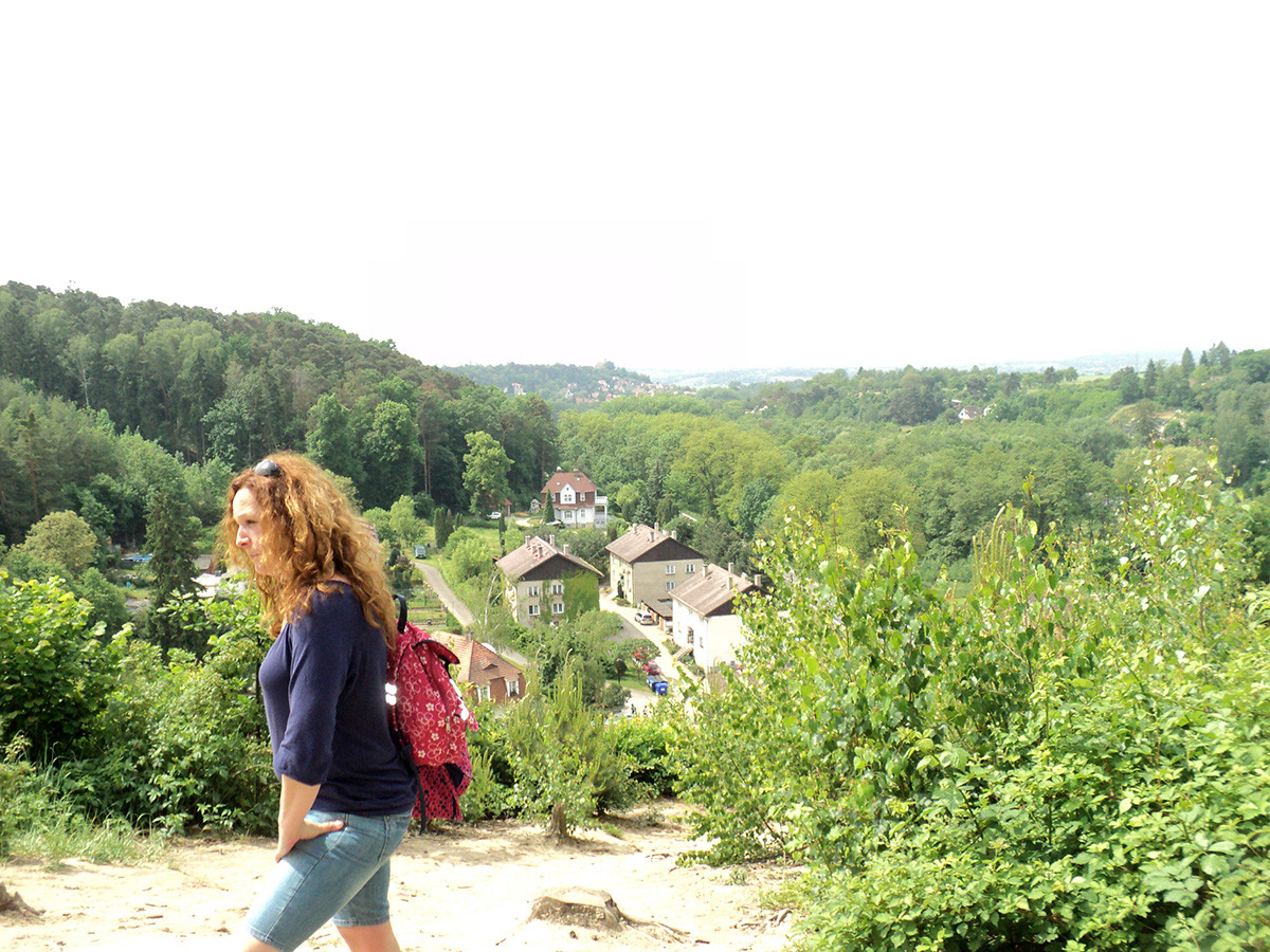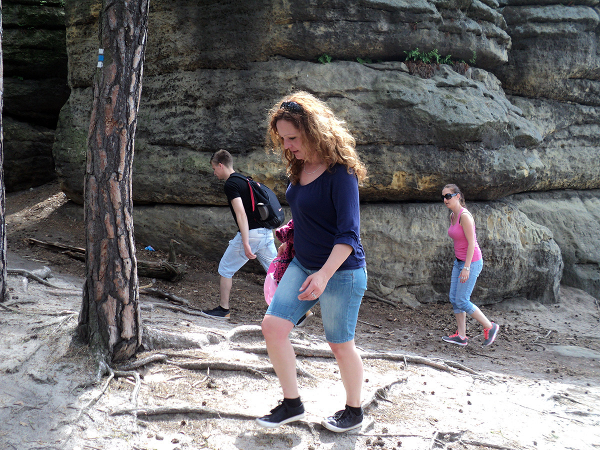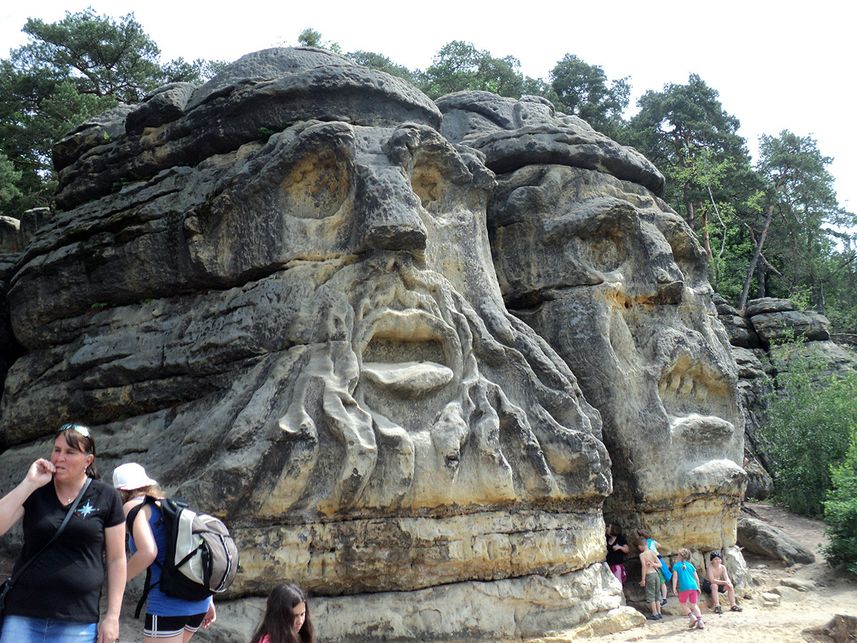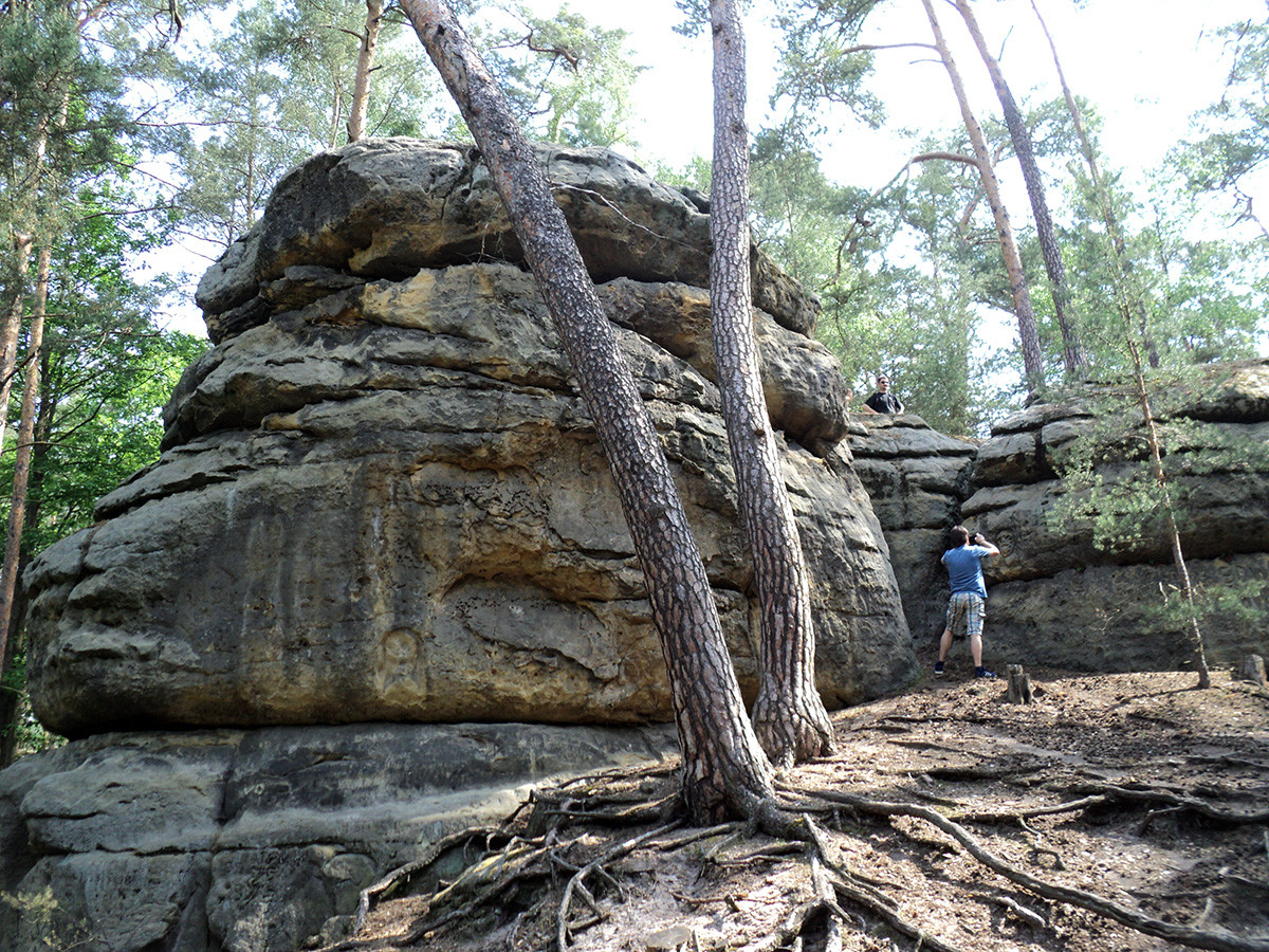 Cesta utekla celkem rychle a kolem půl desátá jsme dorazili do naší první zastávky. Vesnička Želízy se pyšní krásnými sochami Václava Levého, okolo kterých vede stezka, po které se náš oddíl vydal. Krajina je to nádherná. Místy se skýtaly výhledy na okolí, které braly dech. Ve skalách byly vytesány nejrůznější reliéfy v podobě hada, obličejů a podobně. Žádnému dítěti neunikla jediná možnost se skály dotknout nebo na ní vyšplhat. Cestou nás doprovázely informační tabule, takže si všichni mohli přečíst o historii místa.