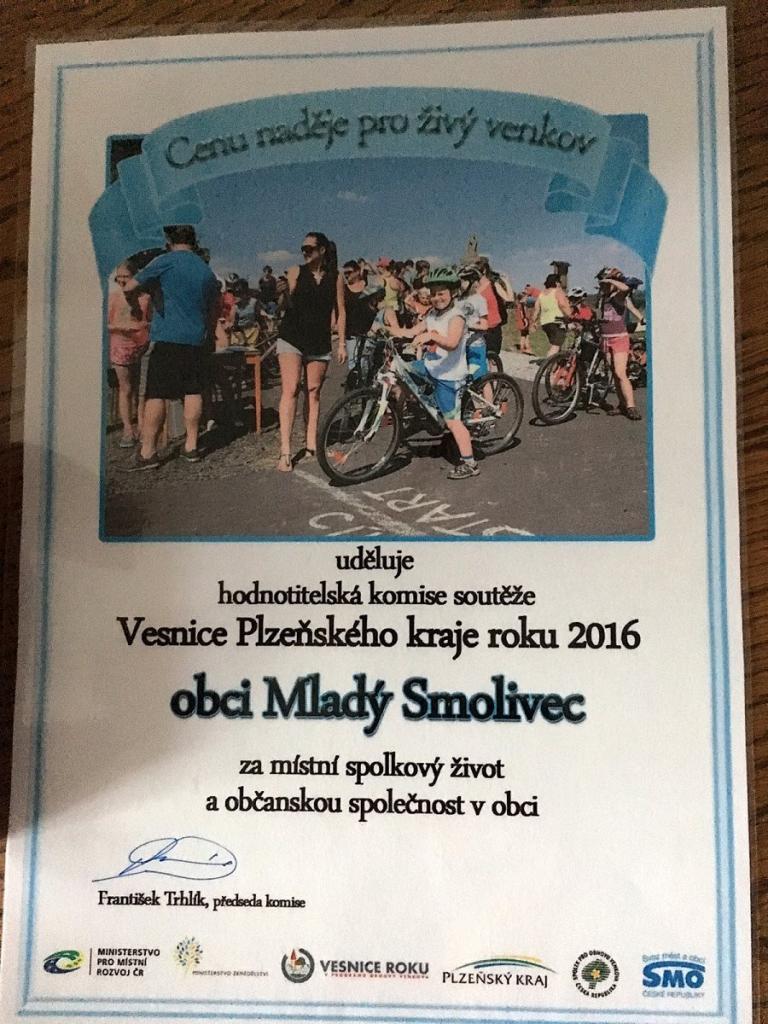 I přes rekordní počet přihlášených obcí (30), získala naše obec ocenění Cena naděje pro živý venkov – Obec Mladý Smolivec (okres Plzeň-jih) a v této kategorii postoupila do celostátního kola. Milé ocenění doprovázel i šek od Plzeňského kraje ve výši 10000 Kč. Děkuji tímto všem dobrovolníkům, firmám a spolkům za pomoc při účasti v této soutěži a za jejich dobrovolnou práci.