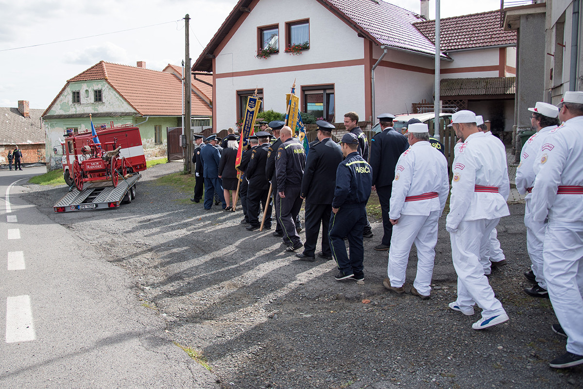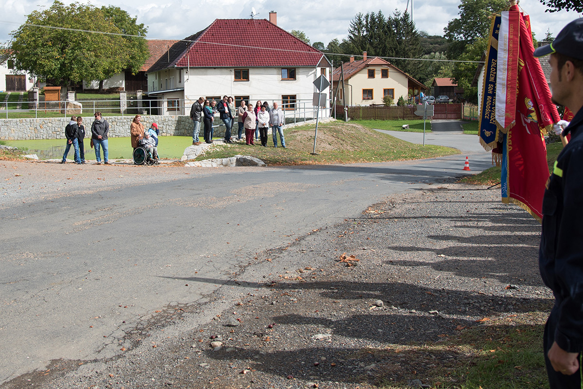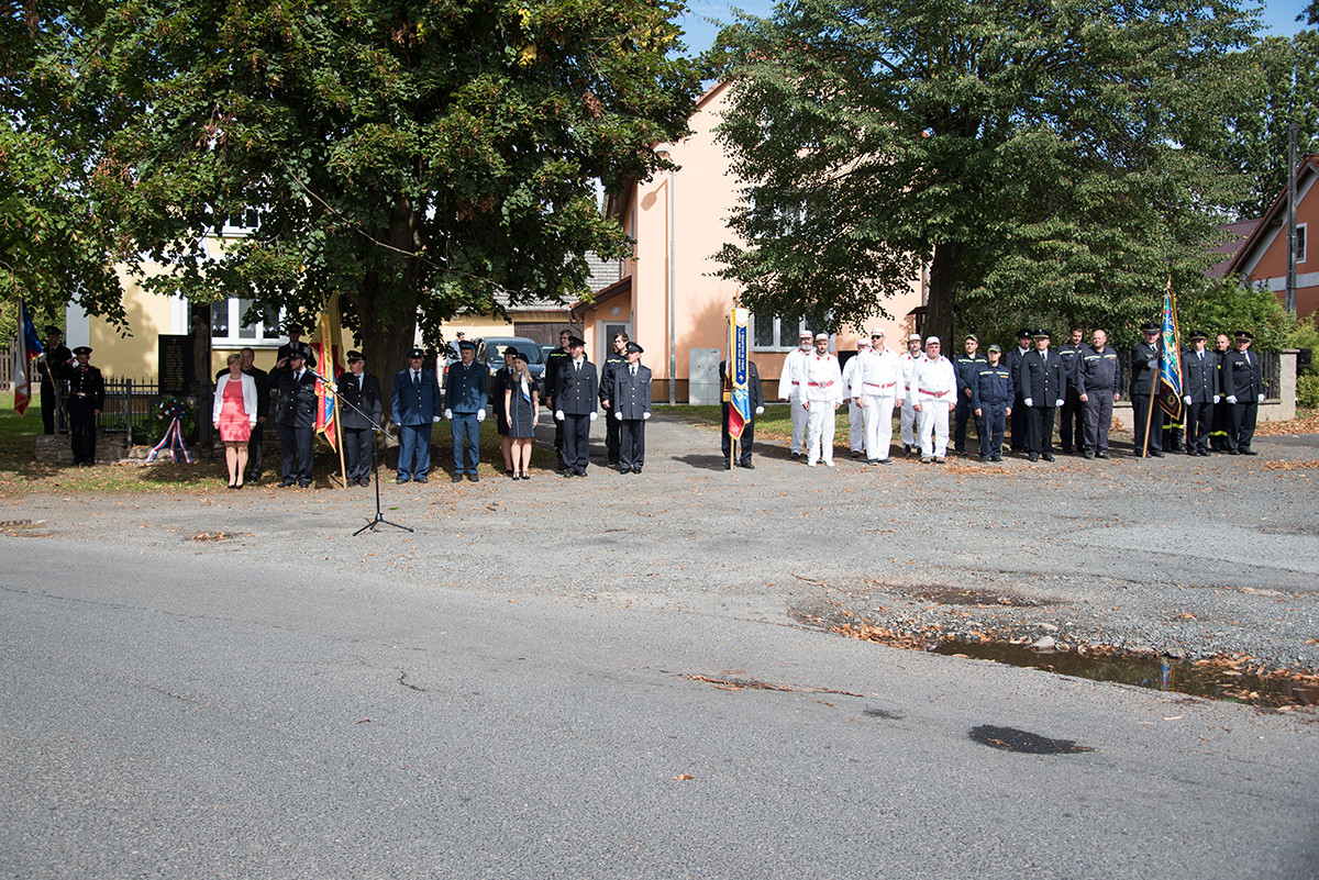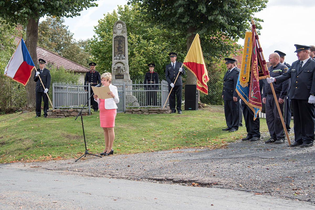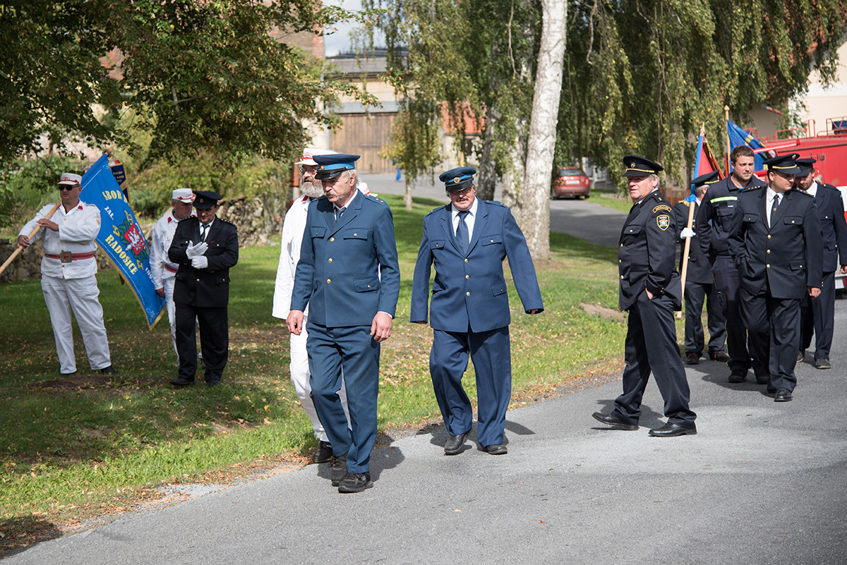 Nicméně zpět k průběhu pietní akce. „Domácí“ hasiči (tedy hasiči ze sboru dané obce, ve které jsme se aktuálně nacházeli) položili věnec na pomník padlých v 1. světové válce. Dále zazněla státní hymna. Poté všechny přítomné přivítala starostka obce, paní Eva Kubová a připojila několik slov úvodem a svým povídáním nás přenesla do dob minulých, konkrétně do roku 1918. Dále mluvila o uplynulých 100 letech a životě v tomto období. V její dojemné řeči ji vystřídal místostarosta obce, pan Jan Spour. Ten přítomným nastínil válečnou situaci a stručný výtah ze zápisků, které čerpal z místních kronik jednotlivých obcí. Poté znovu předal slovo paní starostce, která ocenila jednotlivě každý hasičský sbor za jejich obětavost a péči o svou obec. Následně pietní akci pozvolna ukončila a pozvala všechny přítomné na pietní akty do dalších vesnic a dále na odpolední program do Radošic.