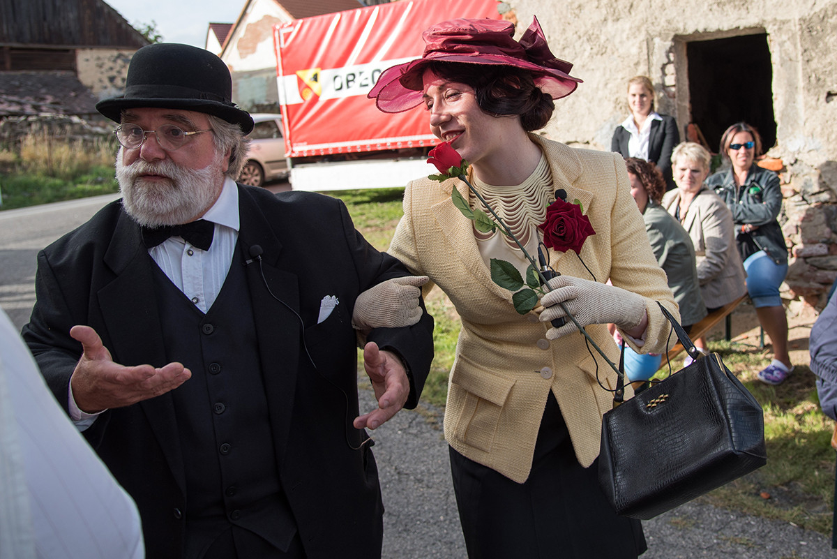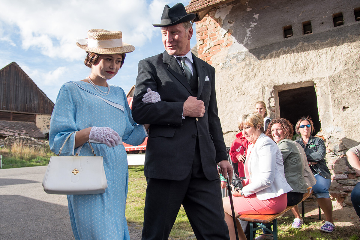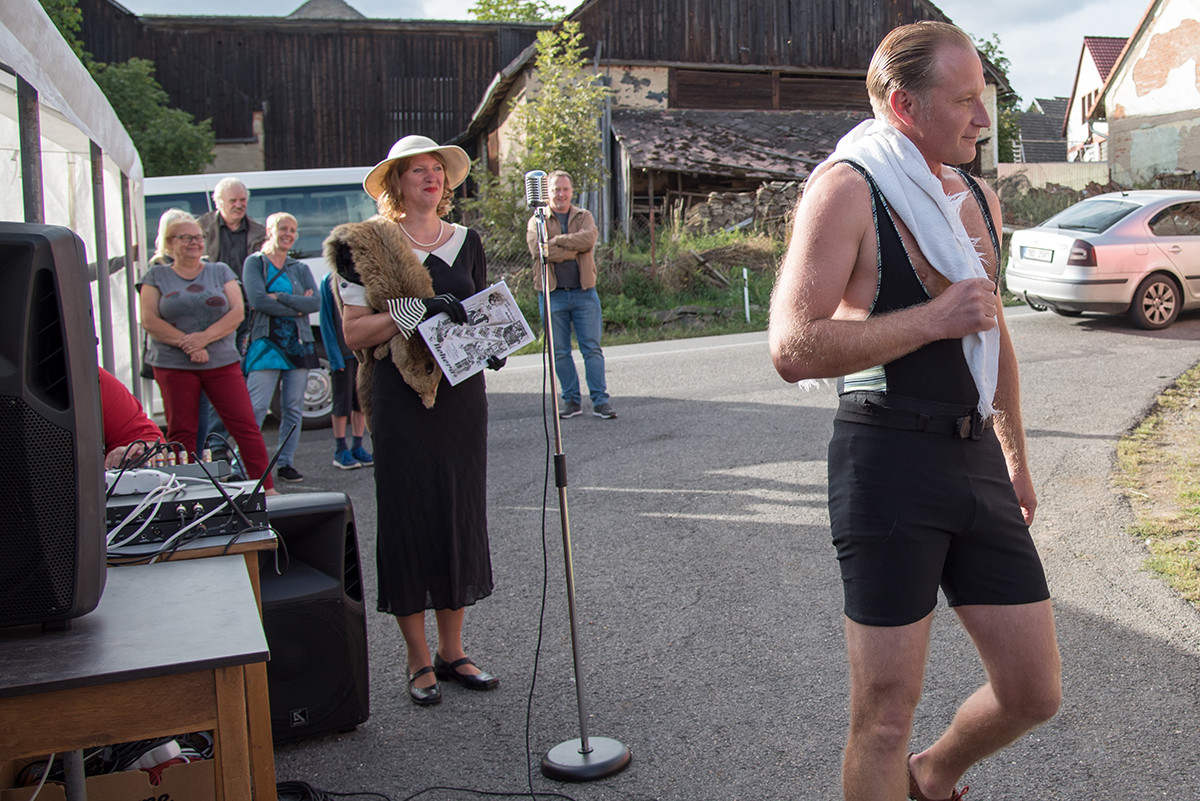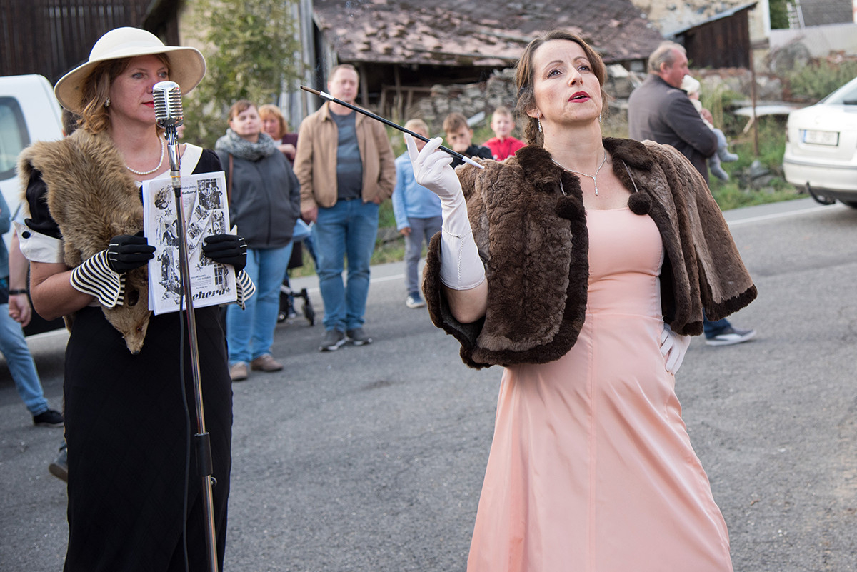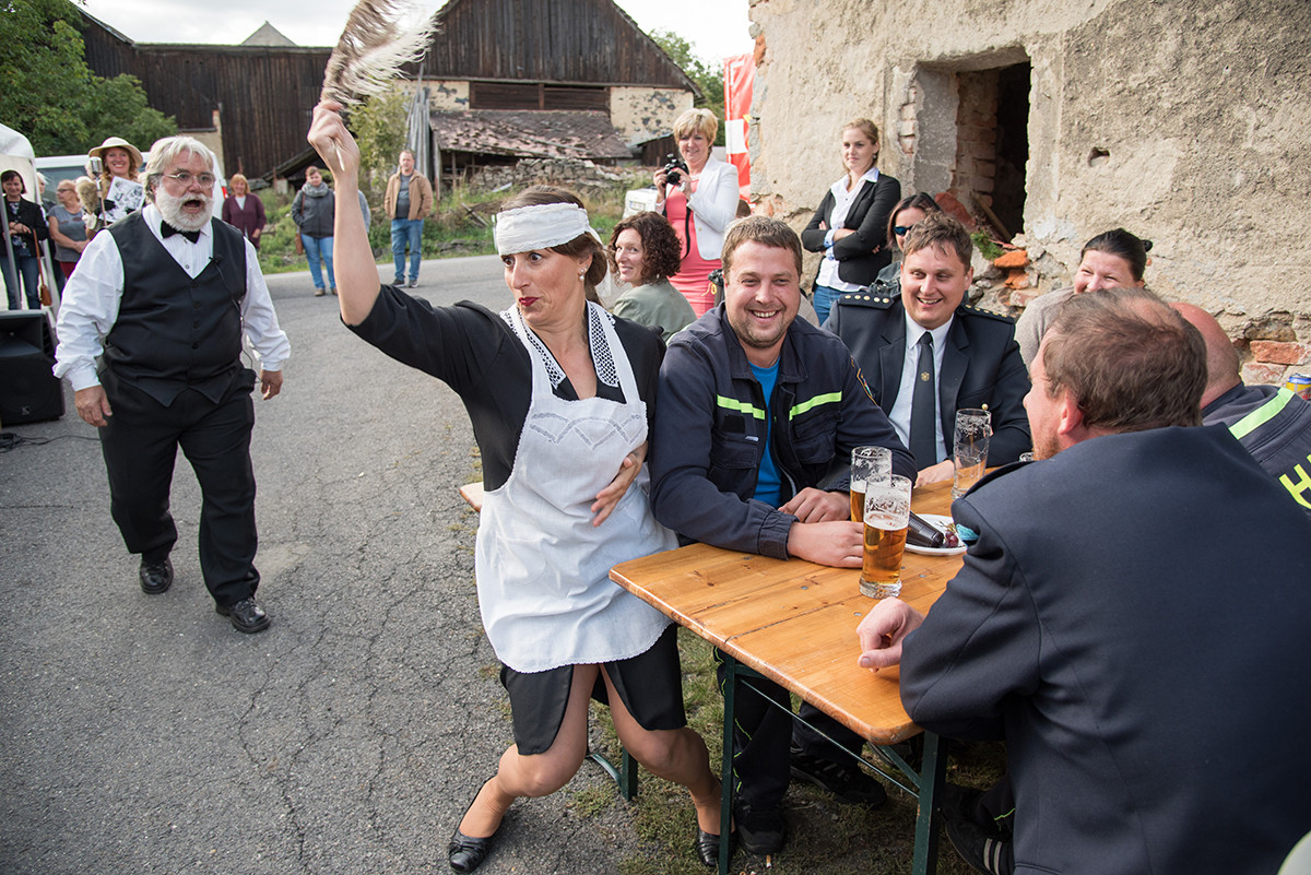 Po příchodu k radošické hospodě, kde byl naplánován zbytek programu, pro nás již bylo připraveno posezení a velké pohoštění v podobě rautu. Odpolední program pak zpestřila kapela Kudrnáči, která nás od 15:00 v místním sále doprovázela dechovou hudbou v našem veselí. Lehce po 16. hodině začalo představení divadla Orel, které nám odhalilo 30. léta minulého století. Mohli jsme si prohlédnout módu tehdejší doby, zkrátka jsme se stali svědky historie 30. let. Toto představení mělo mezi účastníky veliký ohlas. Po představení opět k poslechu a tanci hrála kapela Kudrnáči až do 19. hodiny.