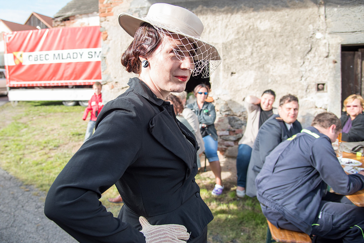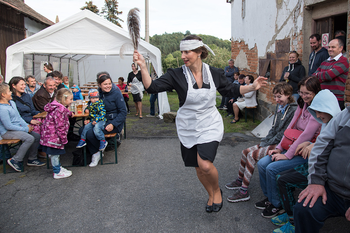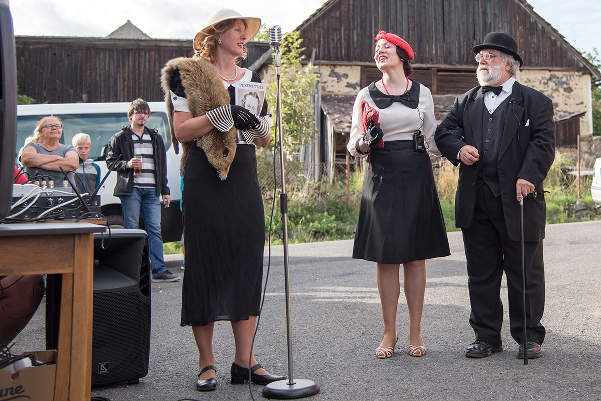 Po příchodu k radošické hospodě, kde byl naplánován zbytek programu, pro nás již bylo připraveno posezení a velké pohoštění v podobě rautu. Odpolední program pak zpestřila kapela Kudrnáči, která nás od 15:00 v místním sále doprovázela dechovou hudbou v našem veselí. Lehce po 16. hodině začalo představení divadla Orel, které nám odhalilo 30. léta minulého století. Mohli jsme si prohlédnout módu tehdejší doby, zkrátka jsme se stali svědky historie 30. let. Toto představení mělo mezi účastníky veliký ohlas. Po představení opět k poslechu a tanci hrála kapela Kudrnáči až do 19. hodiny.