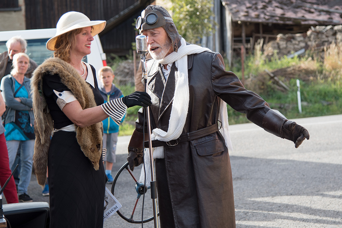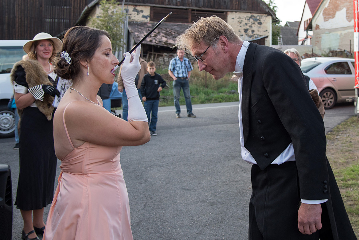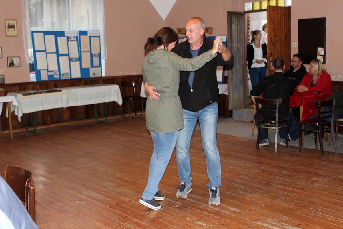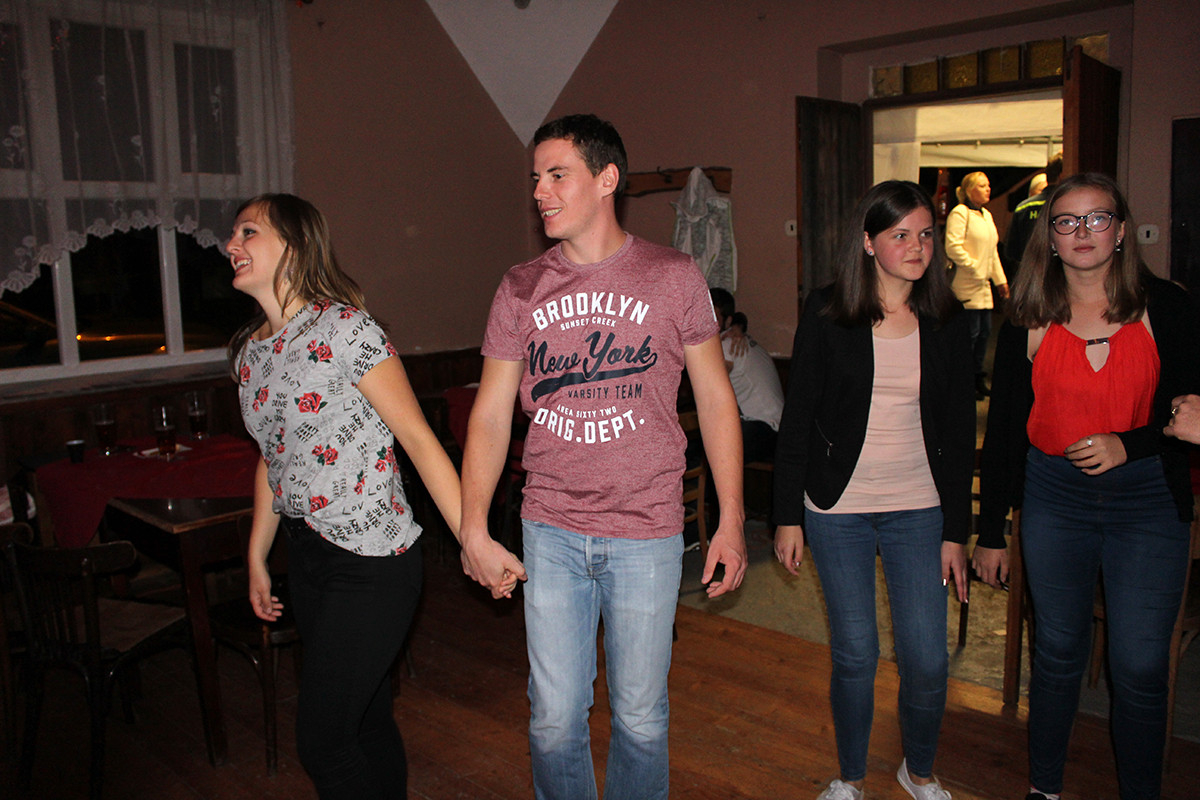 Po příchodu k radošické hospodě, kde byl naplánován zbytek programu, pro nás již bylo připraveno posezení a velké pohoštění v podobě rautu. Odpolední program pak zpestřila kapela Kudrnáči, která nás od 15:00 v místním sále doprovázela dechovou hudbou v našem veselí. Lehce po 16. hodině začalo představení divadla Orel, které nám odhalilo 30. léta minulého století. Mohli jsme si prohlédnout módu tehdejší doby, zkrátka jsme se stali svědky historie 30. let. Toto představení mělo mezi účastníky veliký ohlas. Po představení opět k poslechu a tanci hrála kapela Kudrnáči až do 19. hodiny.