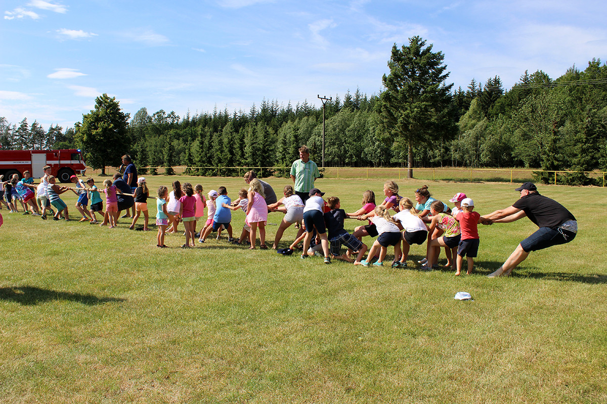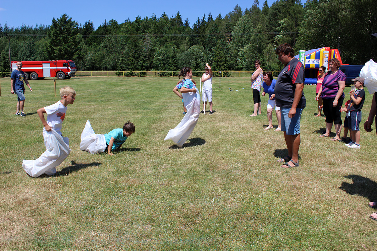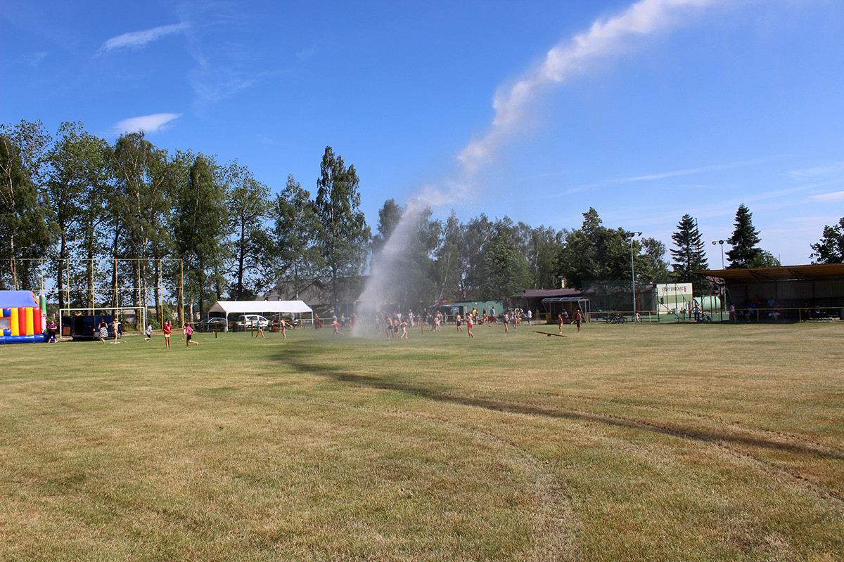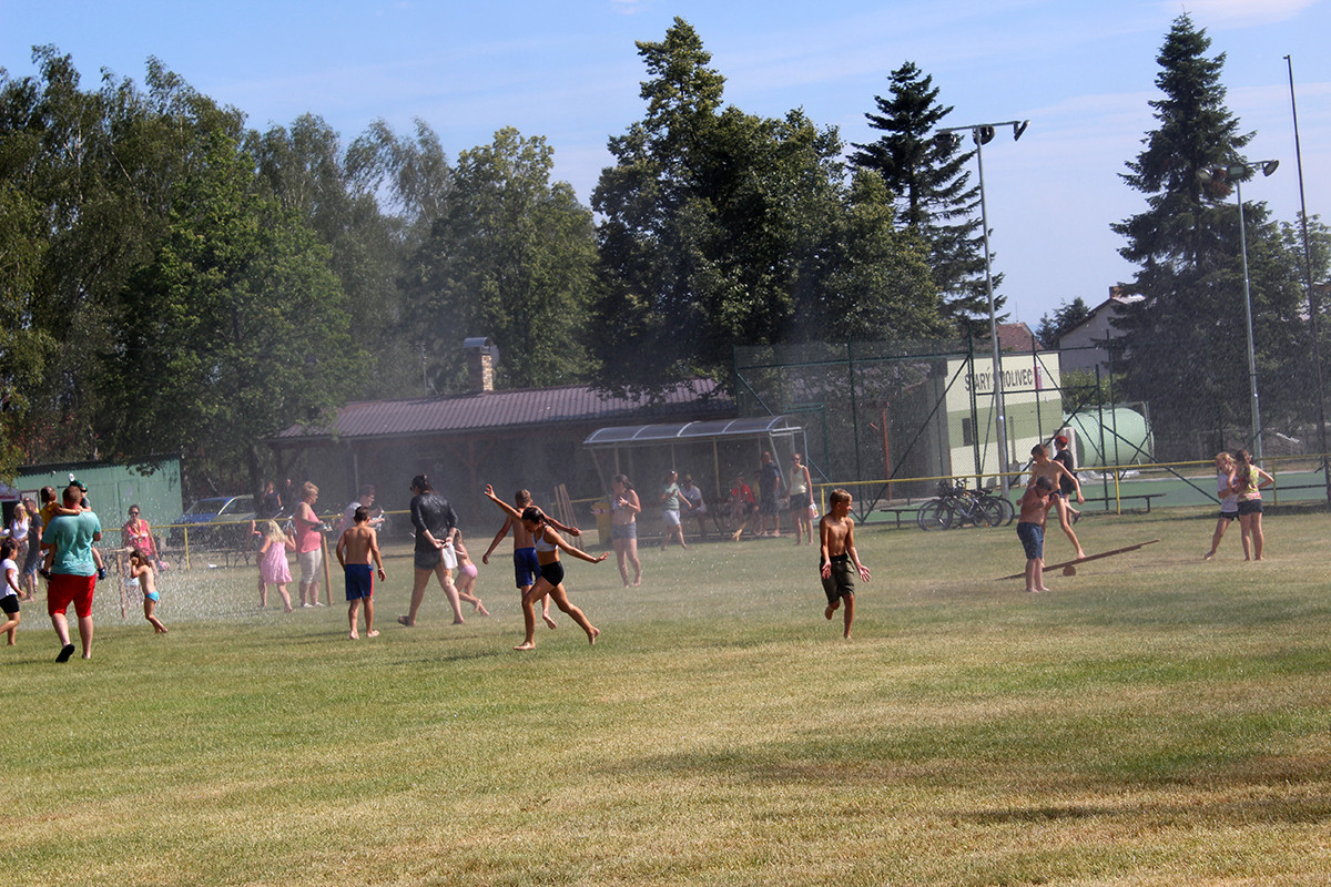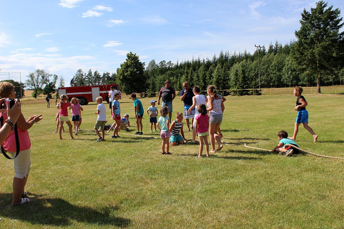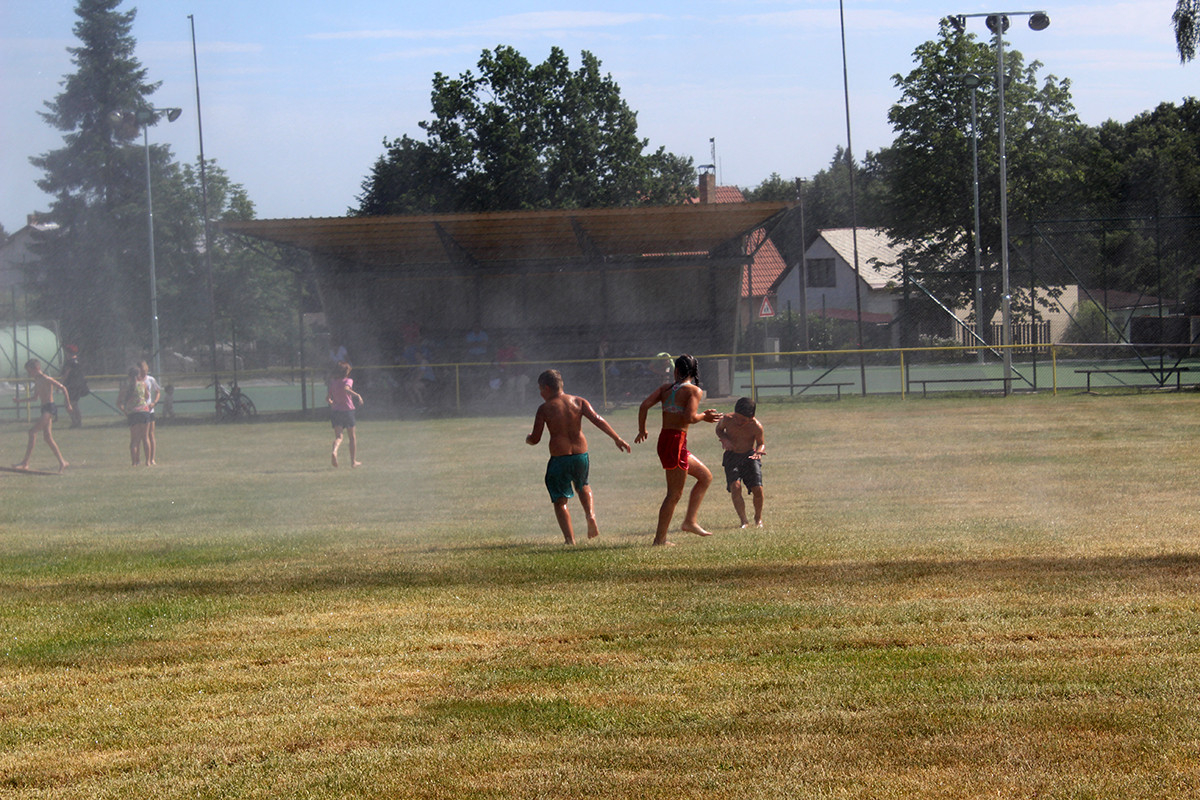 Po výletě z lesa se trochu ochladily nanukem, kdo chtěl, mohl si dát klobásu či točenou limču. A pak došlo na vyhlašování sportovních disciplín. Všechny děti dostaly balíček s překvapením a každé ještě dostalo medaili za účast. A protože horko bylo veliké, hasiči připravili cisternu a děti pěkně pokropili. To je asi to nejlepší, na co se děti těší. Rodiče už méně, ale co by pro své ratolesti neudělali ????. Během celého odpoledne si mohly děti zařádit v nafukovacím hradu či na trampolíně, což také plně využívaly.