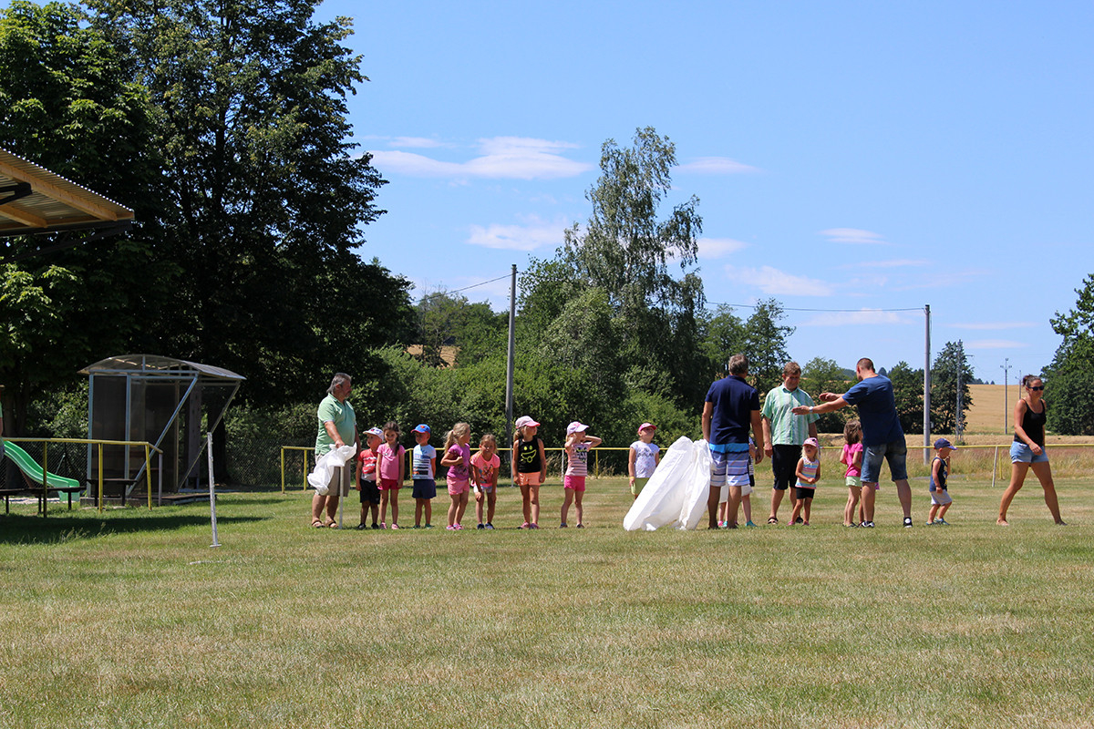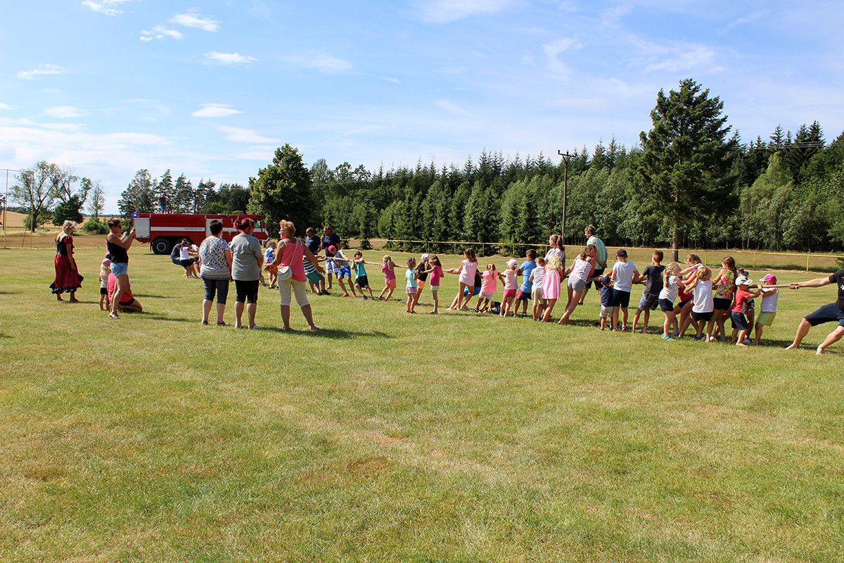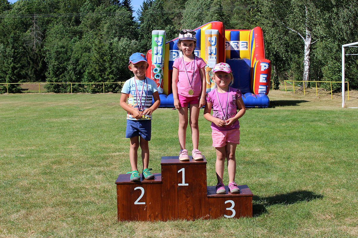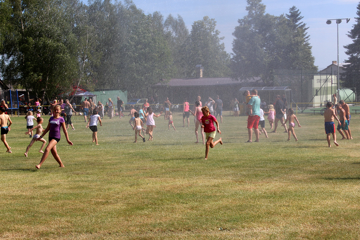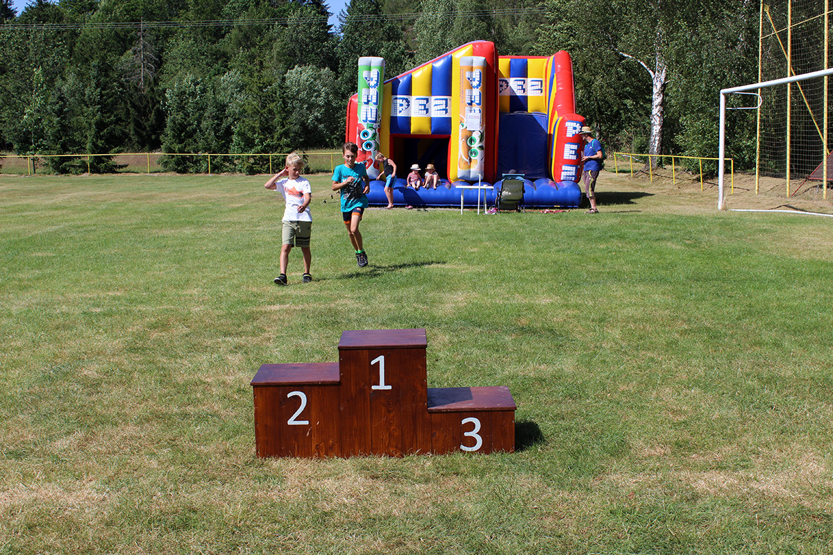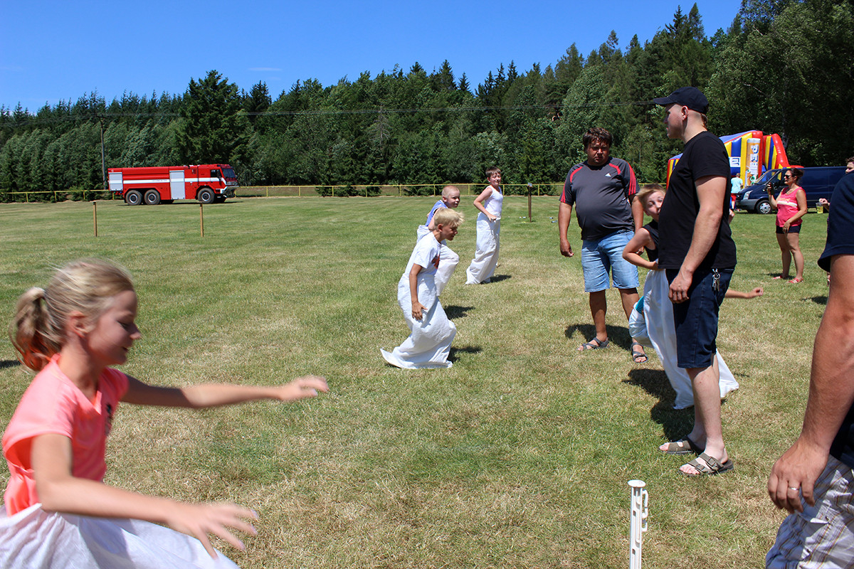 Po výletě z lesa se trochu ochladily nanukem, kdo chtěl, mohl si dát klobásu či točenou limču. A pak došlo na vyhlašování sportovních disciplín. Všechny děti dostaly balíček s překvapením a každé ještě dostalo medaili za účast. A protože horko bylo veliké, hasiči připravili cisternu a děti pěkně pokropili. To je asi to nejlepší, na co se děti těší. Rodiče už méně, ale co by pro své ratolesti neudělali ????. Během celého odpoledne si mohly děti zařádit v nafukovacím hradu či na trampolíně, což také plně využívaly.