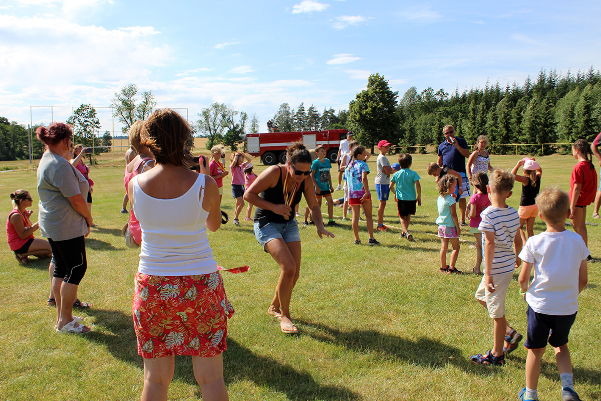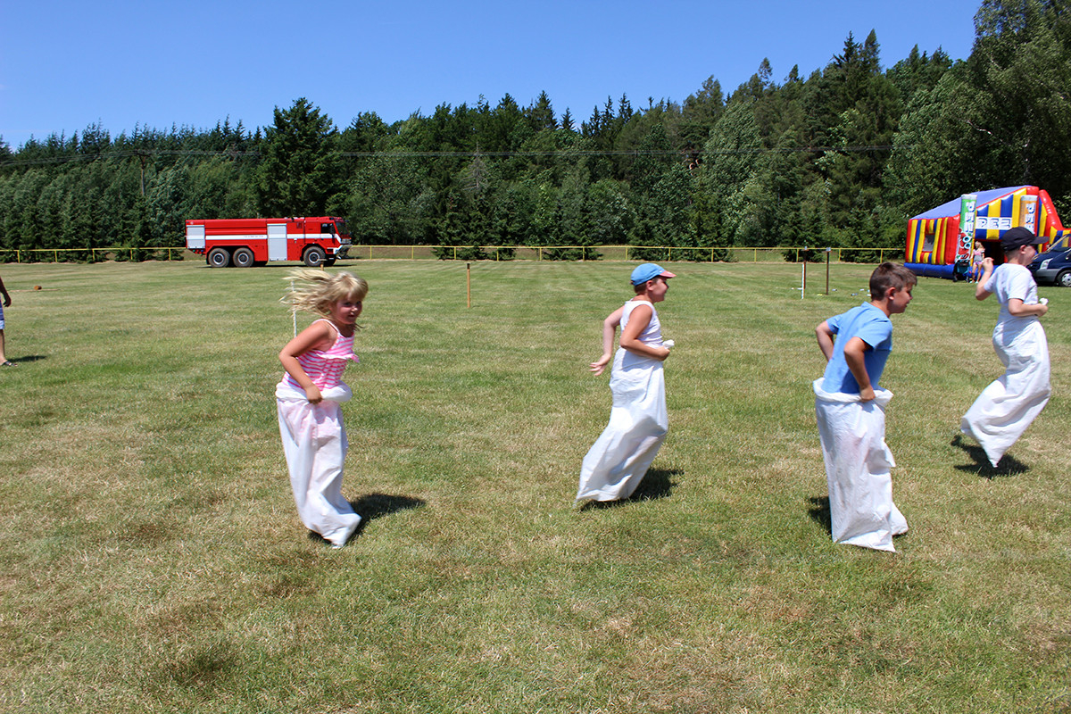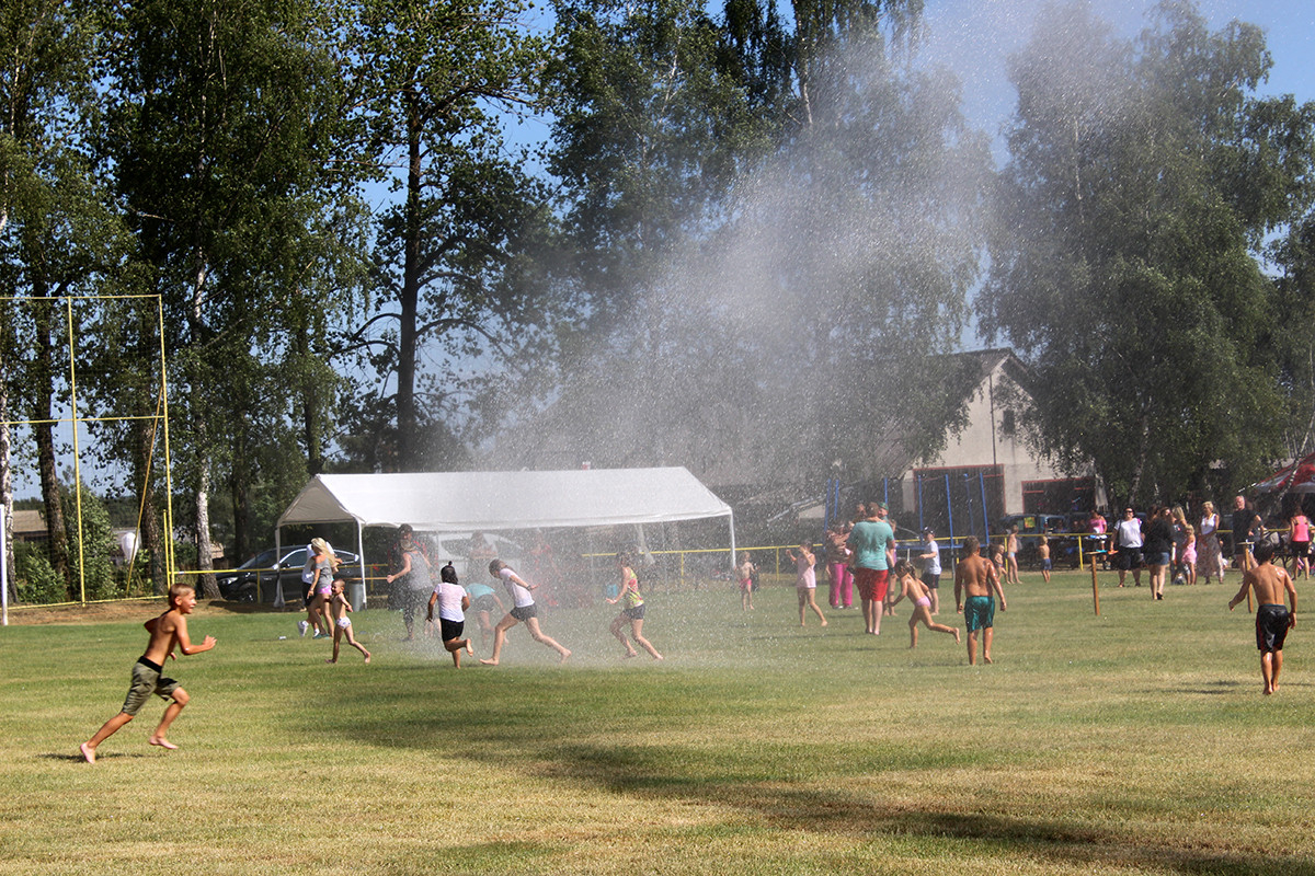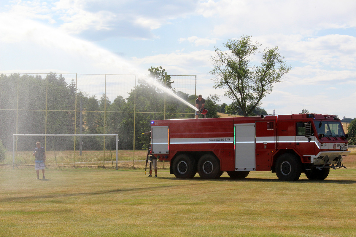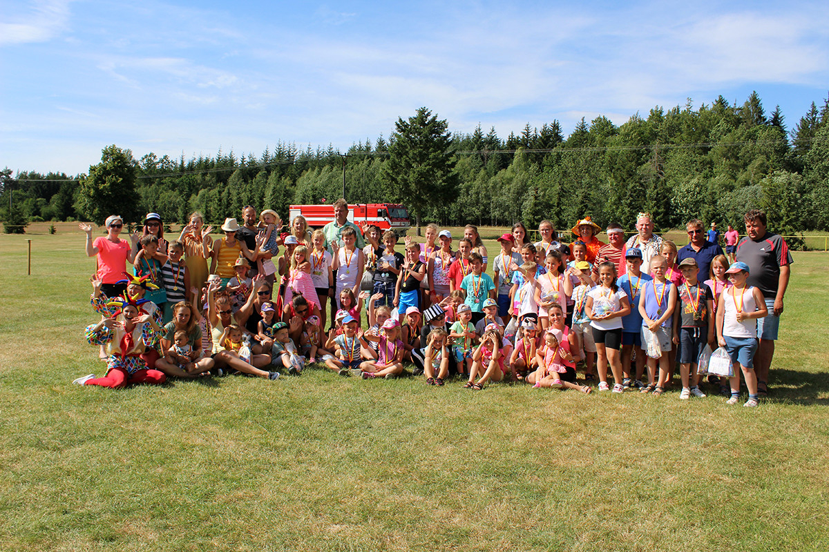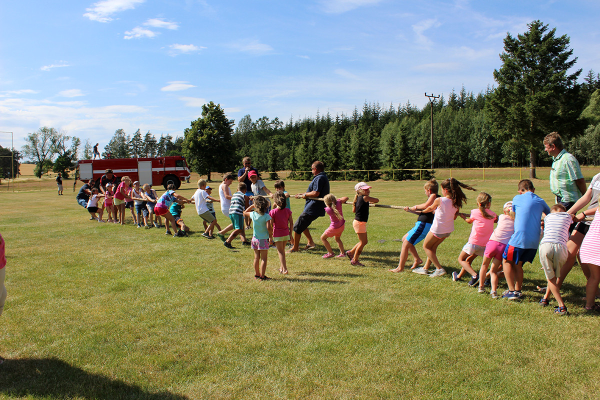 Po výletě z lesa se trochu ochladily nanukem, kdo chtěl, mohl si dát klobásu či točenou limču. A pak došlo na vyhlašování sportovních disciplín. Všechny děti dostaly balíček s překvapením a každé ještě dostalo medaili za účast. A protože horko bylo veliké, hasiči připravili cisternu a děti pěkně pokropili. To je asi to nejlepší, na co se děti těší. Rodiče už méně, ale co by pro své ratolesti neudělali ????. Během celého odpoledne si mohly děti zařádit v nafukovacím hradu či na trampolíně, což také plně využívaly.