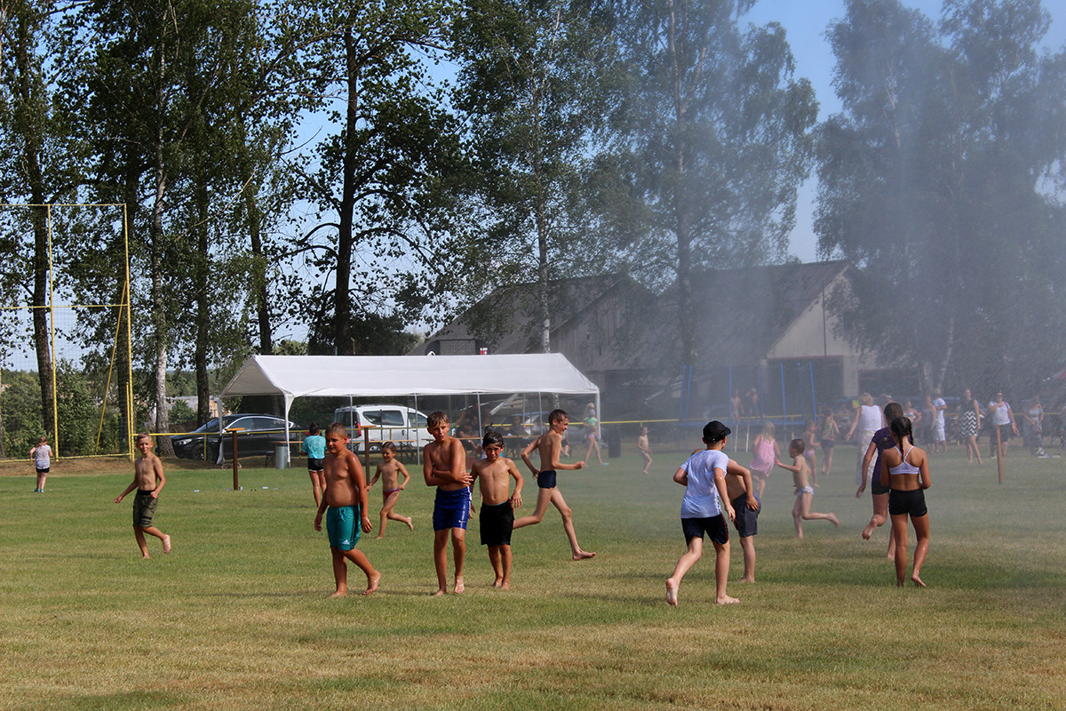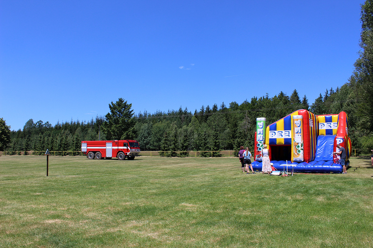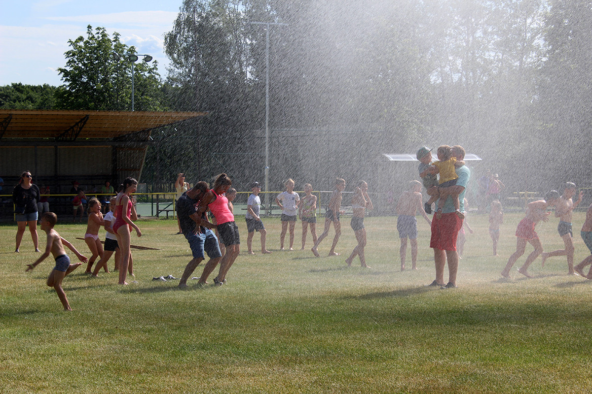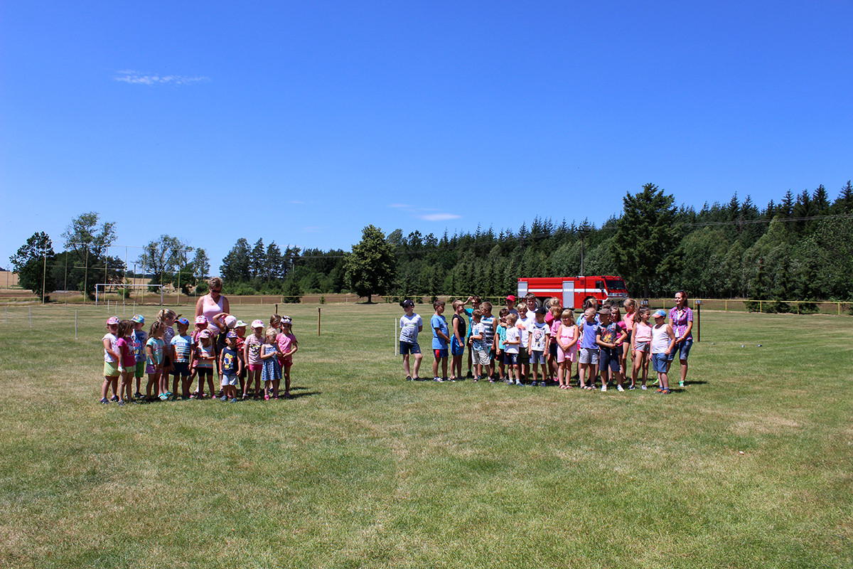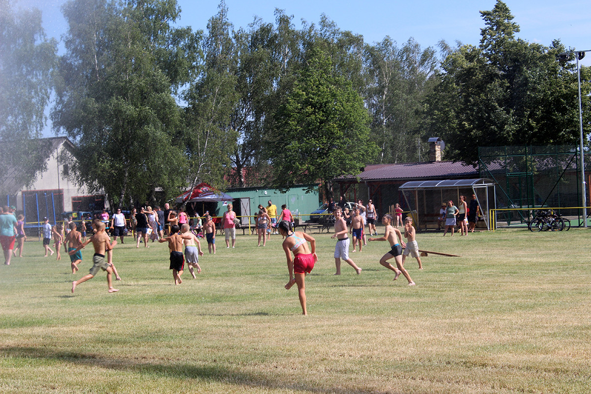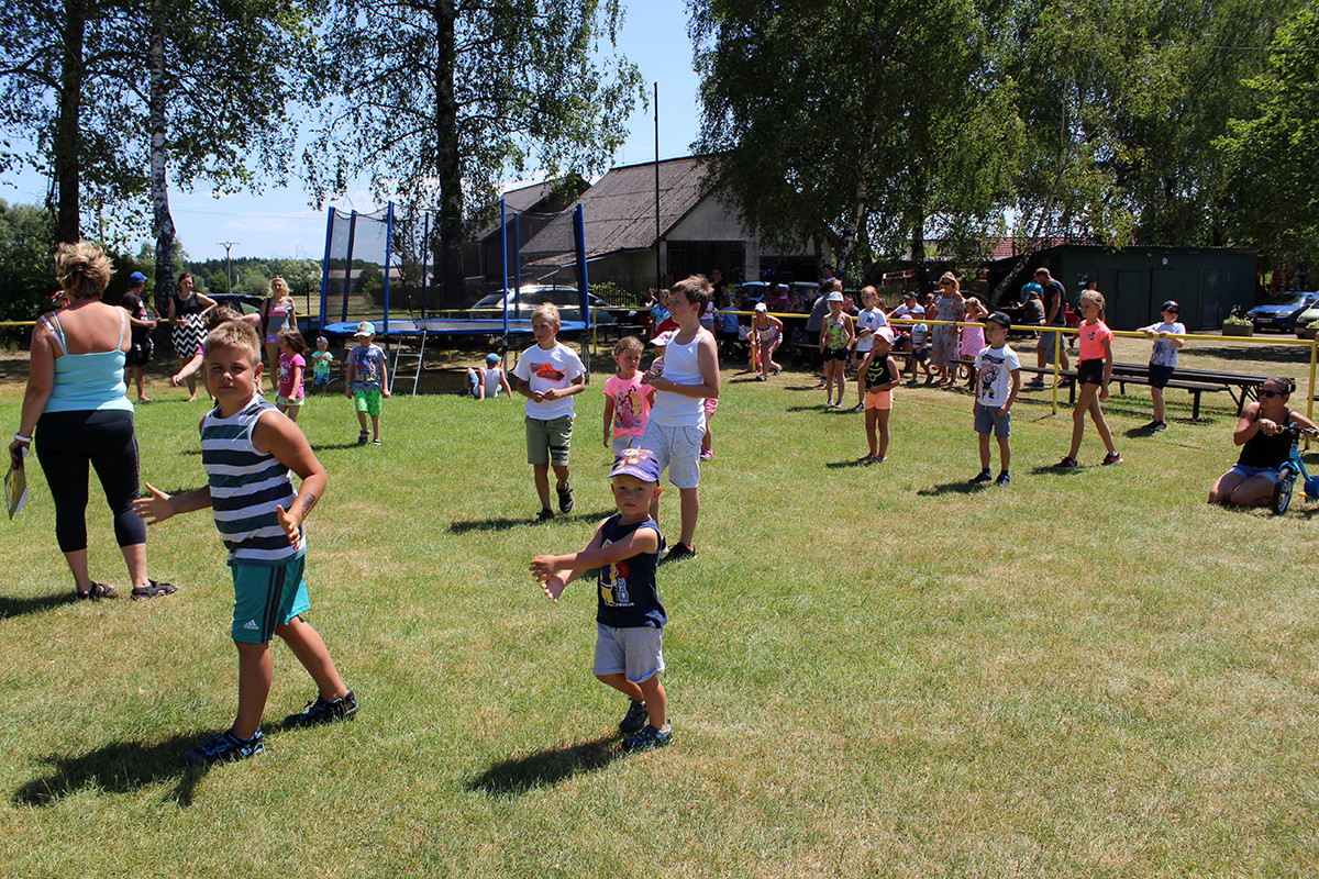 Po výletě z lesa se trochu ochladily nanukem, kdo chtěl, mohl si dát klobásu či točenou limču. A pak došlo na vyhlašování sportovních disciplín. Všechny děti dostaly balíček s překvapením a každé ještě dostalo medaili za účast. A protože horko bylo veliké, hasiči připravili cisternu a děti pěkně pokropili. To je asi to nejlepší, na co se děti těší. Rodiče už méně, ale co by pro své ratolesti neudělali ????. Během celého odpoledne si mohly děti zařádit v nafukovacím hradu či na trampolíně, což také plně využívaly.
