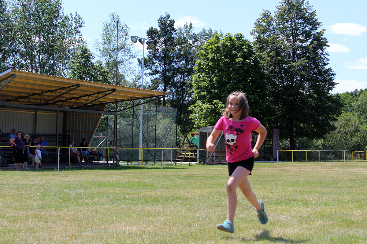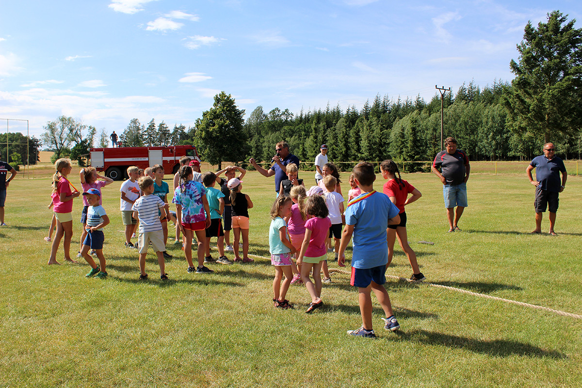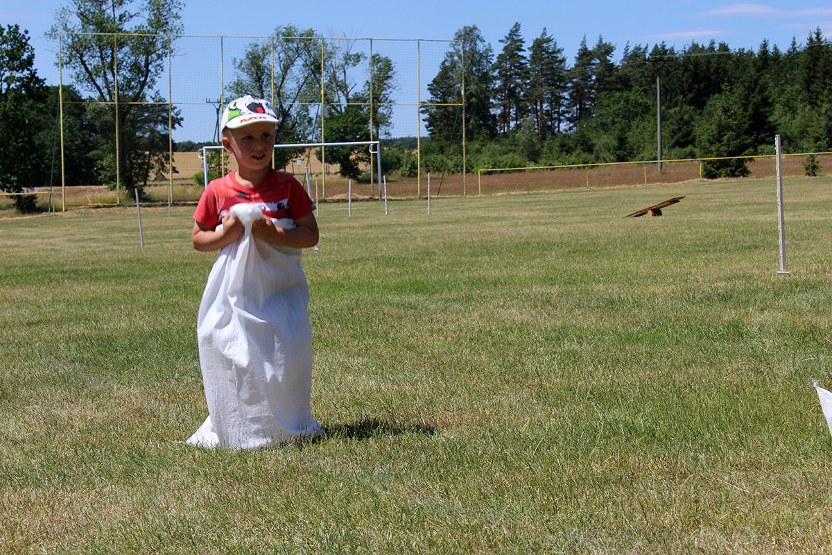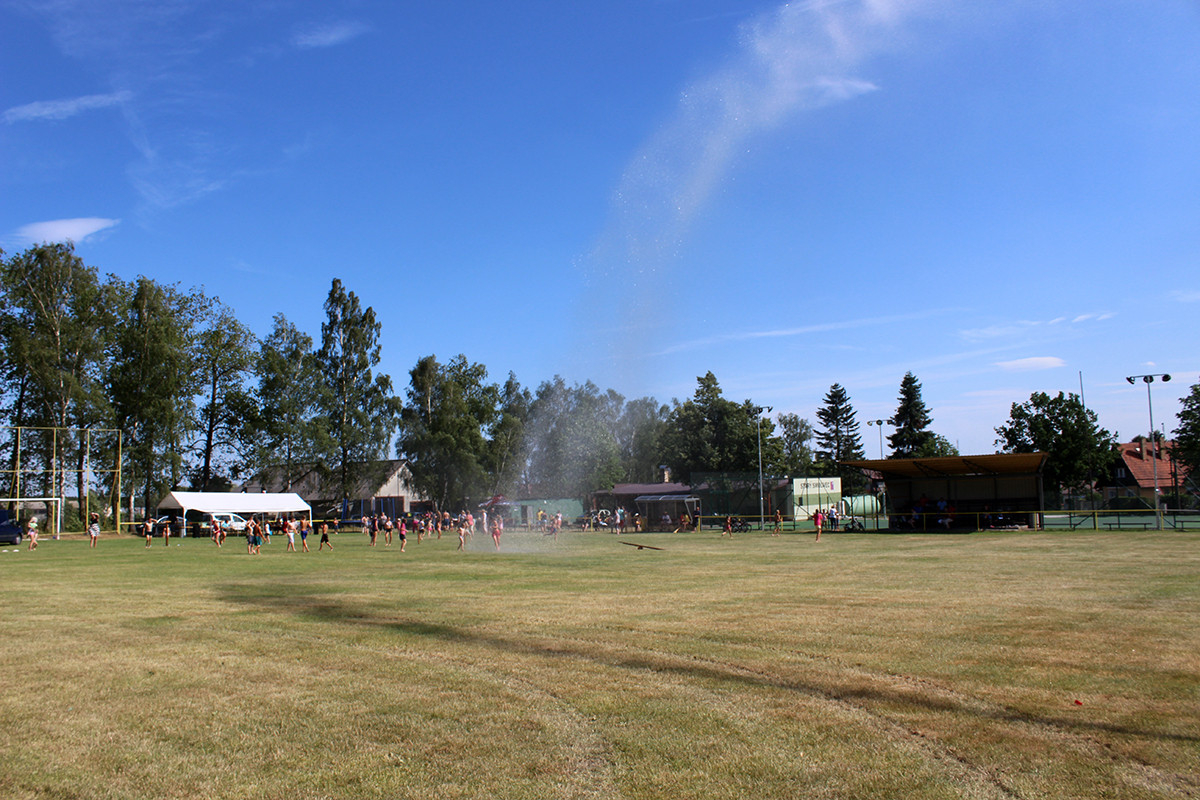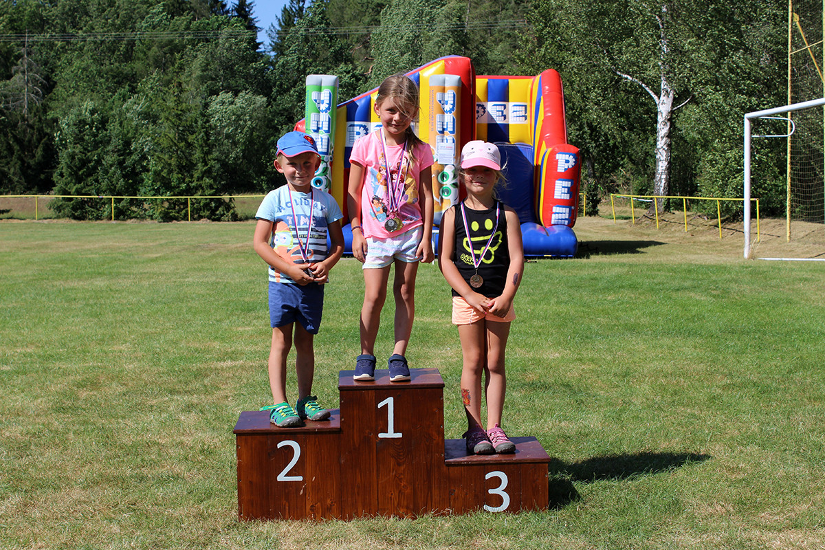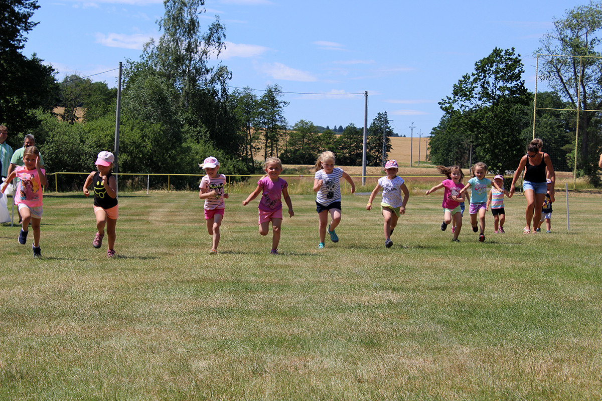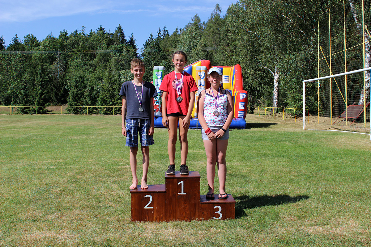 Po výletě z lesa se trochu ochladily nanukem, kdo chtěl, mohl si dát klobásu či točenou limču. A pak došlo na vyhlašování sportovních disciplín. Všechny děti dostaly balíček s překvapením a každé ještě dostalo medaili za účast. A protože horko bylo veliké, hasiči připravili cisternu a děti pěkně pokropili. To je asi to nejlepší, na co se děti těší. Rodiče už méně, ale co by pro své ratolesti neudělali ????. Během celého odpoledne si mohly děti zařádit v nafukovacím hradu či na trampolíně, což také plně využívaly.
