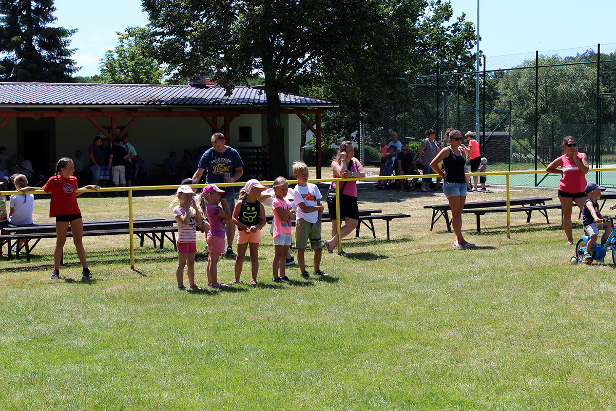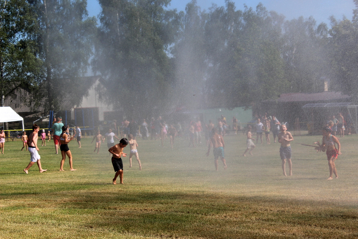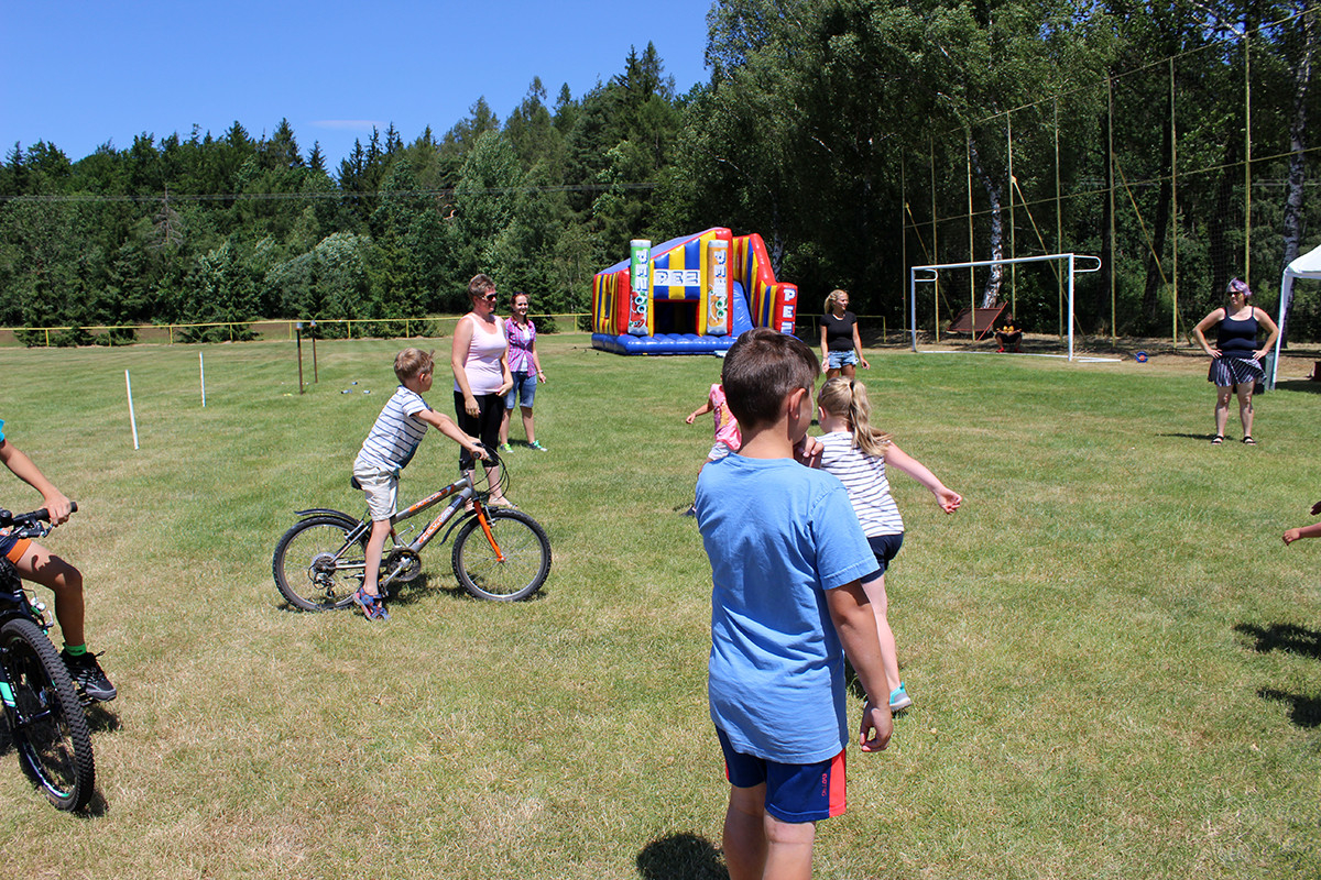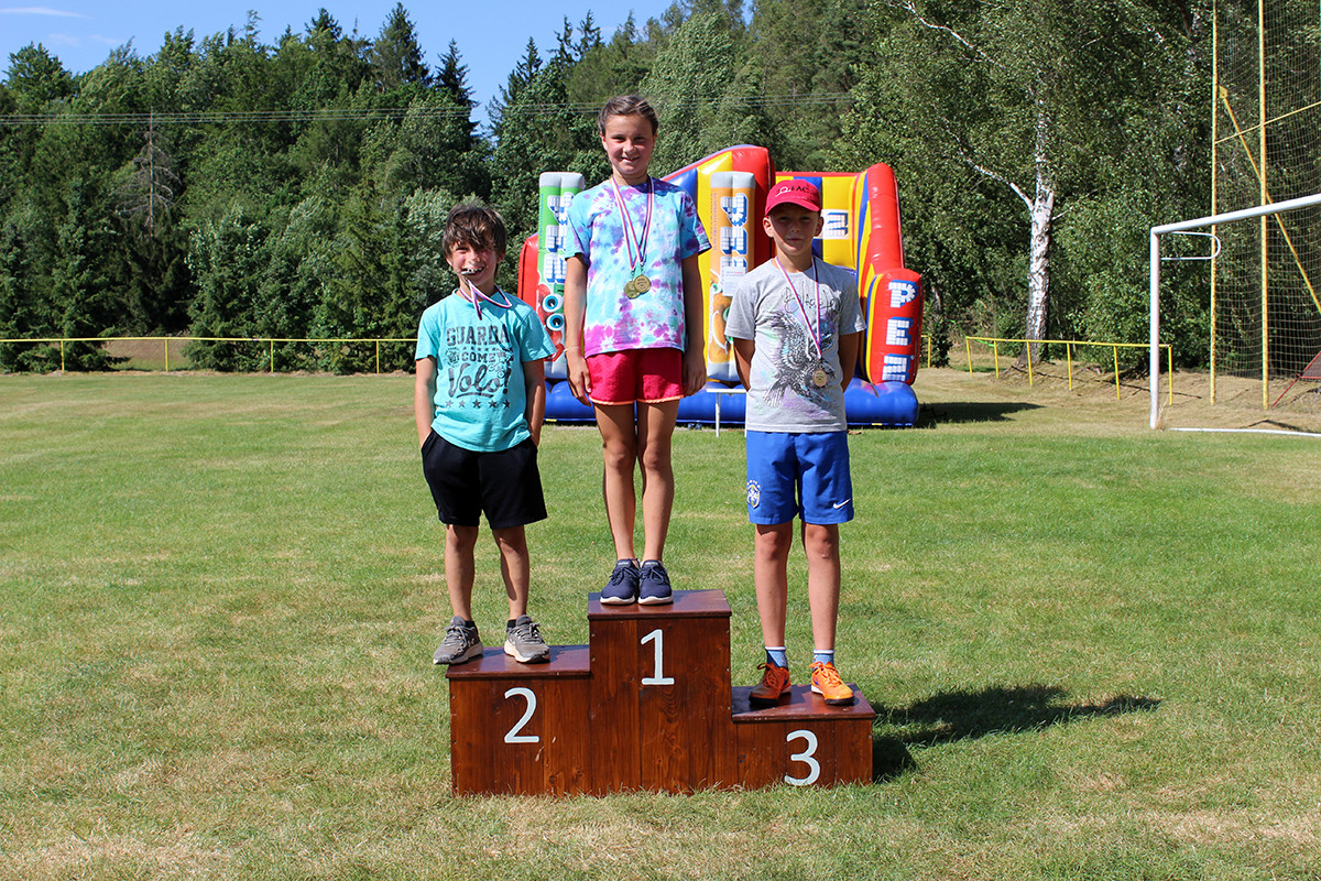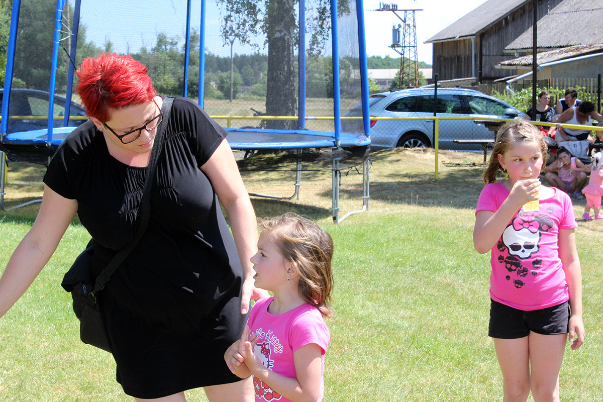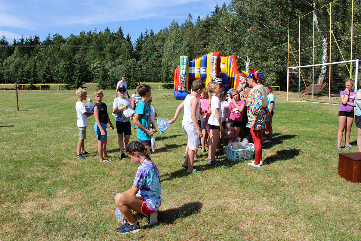 Po výletě z lesa se trochu ochladily nanukem, kdo chtěl, mohl si dát klobásu či točenou limču. A pak došlo na vyhlašování sportovních disciplín. Všechny děti dostaly balíček s překvapením a každé ještě dostalo medaili za účast. A protože horko bylo veliké, hasiči připravili cisternu a děti pěkně pokropili. To je asi to nejlepší, na co se děti těší. Rodiče už méně, ale co by pro své ratolesti neudělali ????. Během celého odpoledne si mohly děti zařádit v nafukovacím hradu či na trampolíně, což také plně využívaly.