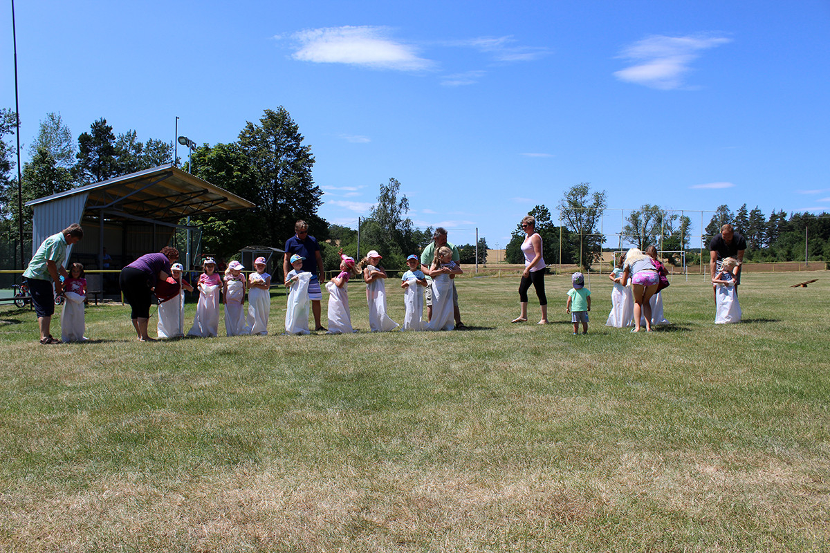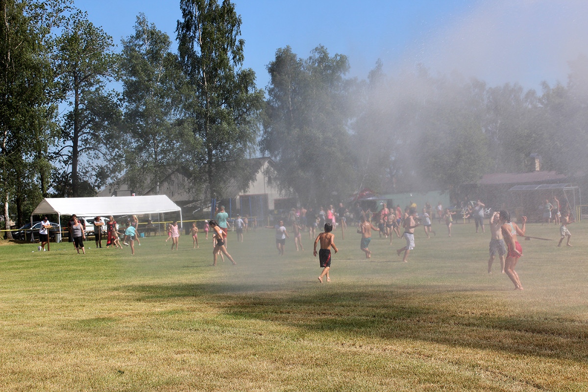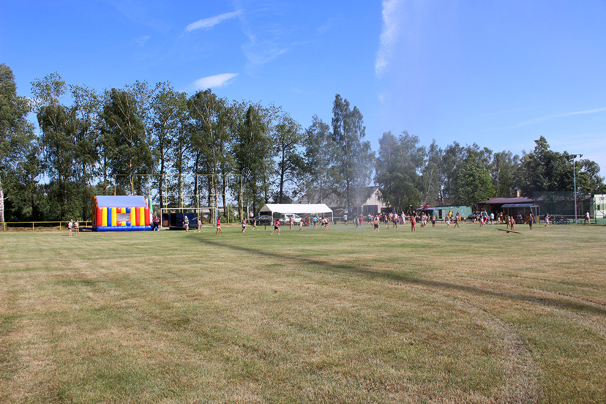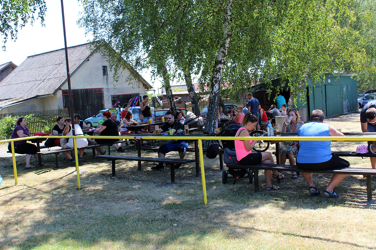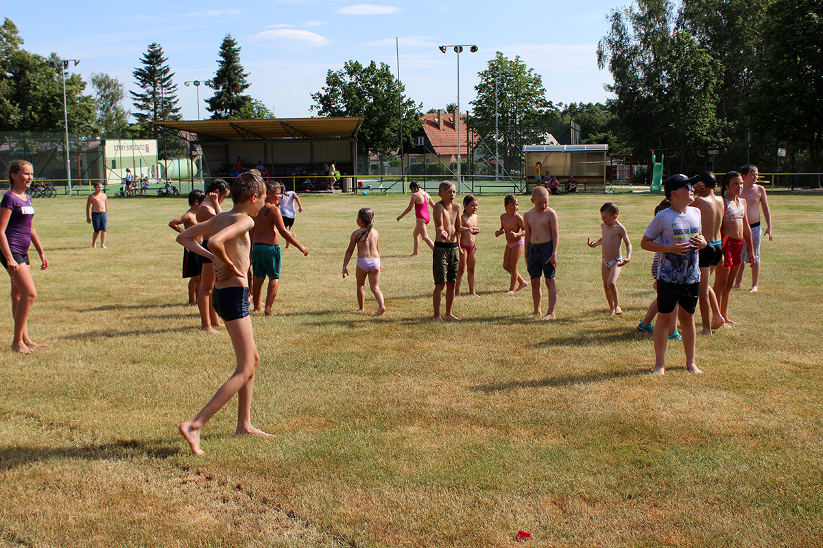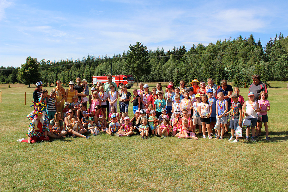 Po výletě z lesa se trochu ochladily nanukem, kdo chtěl, mohl si dát klobásu či točenou limču. A pak došlo na vyhlašování sportovních disciplín. Všechny děti dostaly balíček s překvapením a každé ještě dostalo medaili za účast. A protože horko bylo veliké, hasiči připravili cisternu a děti pěkně pokropili. To je asi to nejlepší, na co se děti těší. Rodiče už méně, ale co by pro své ratolesti neudělali ????. Během celého odpoledne si mohly děti zařádit v nafukovacím hradu či na trampolíně, což také plně využívaly.