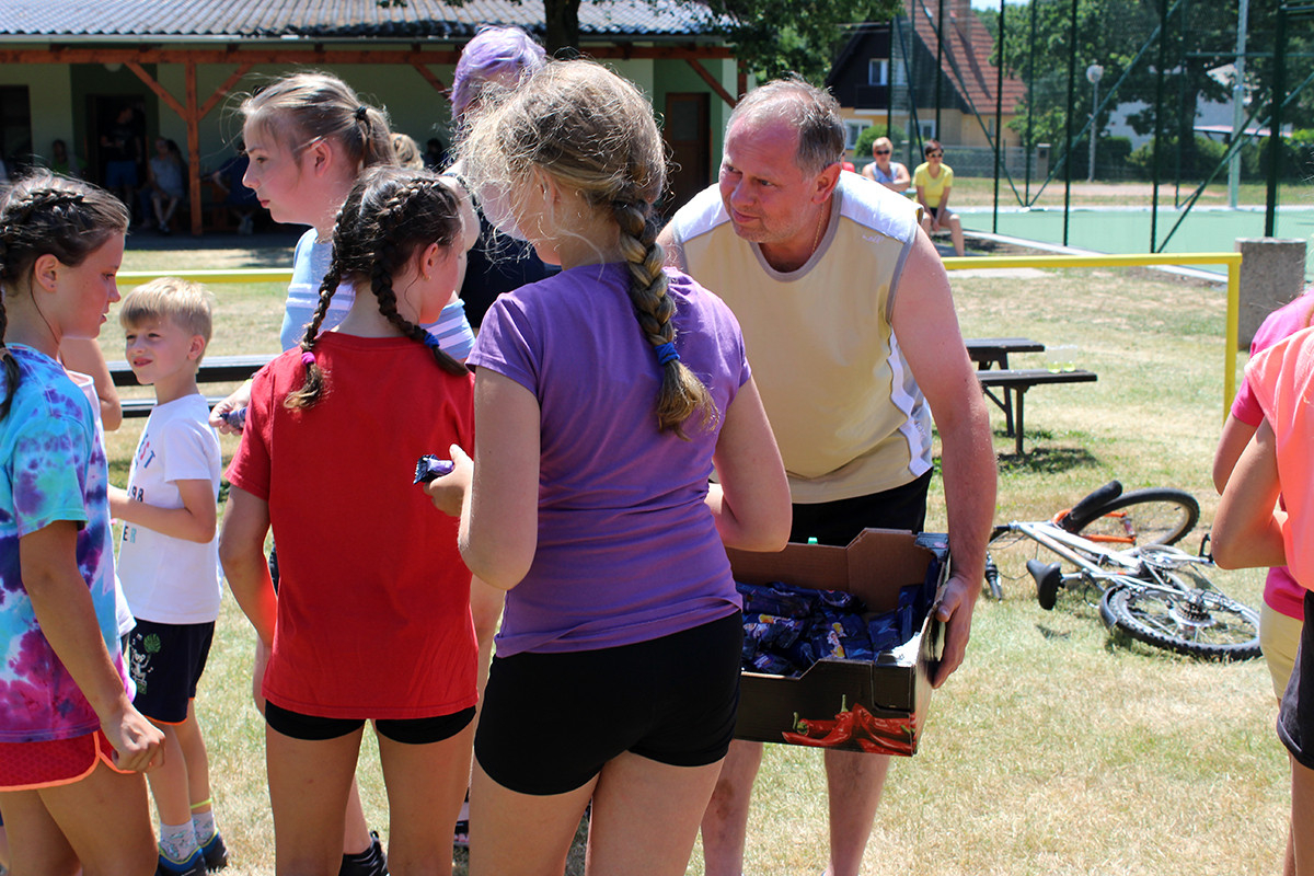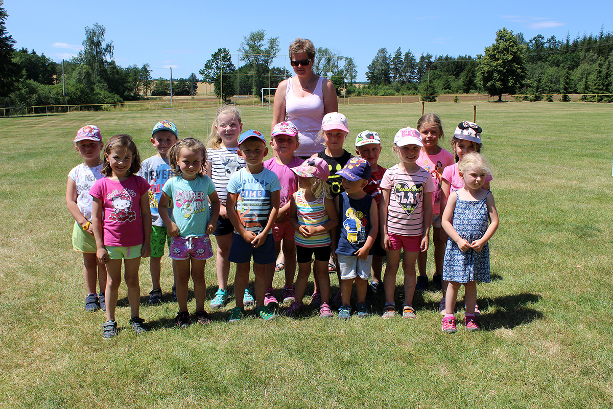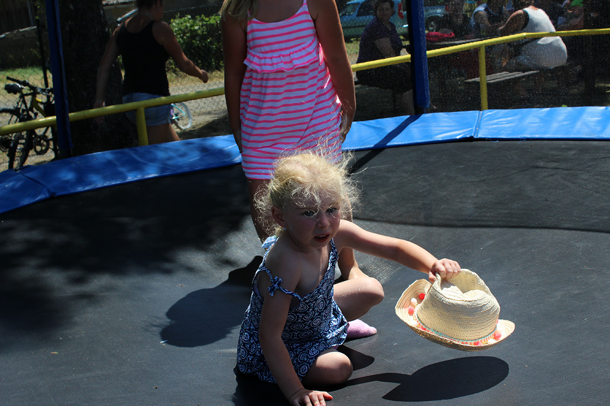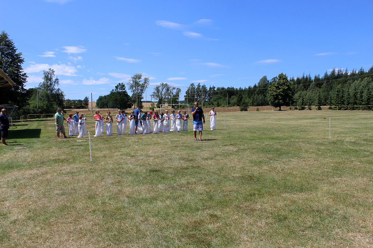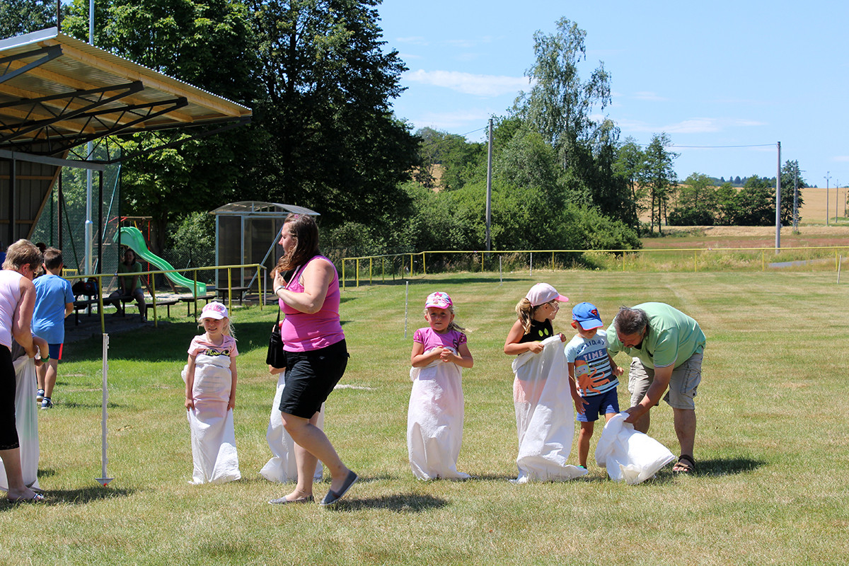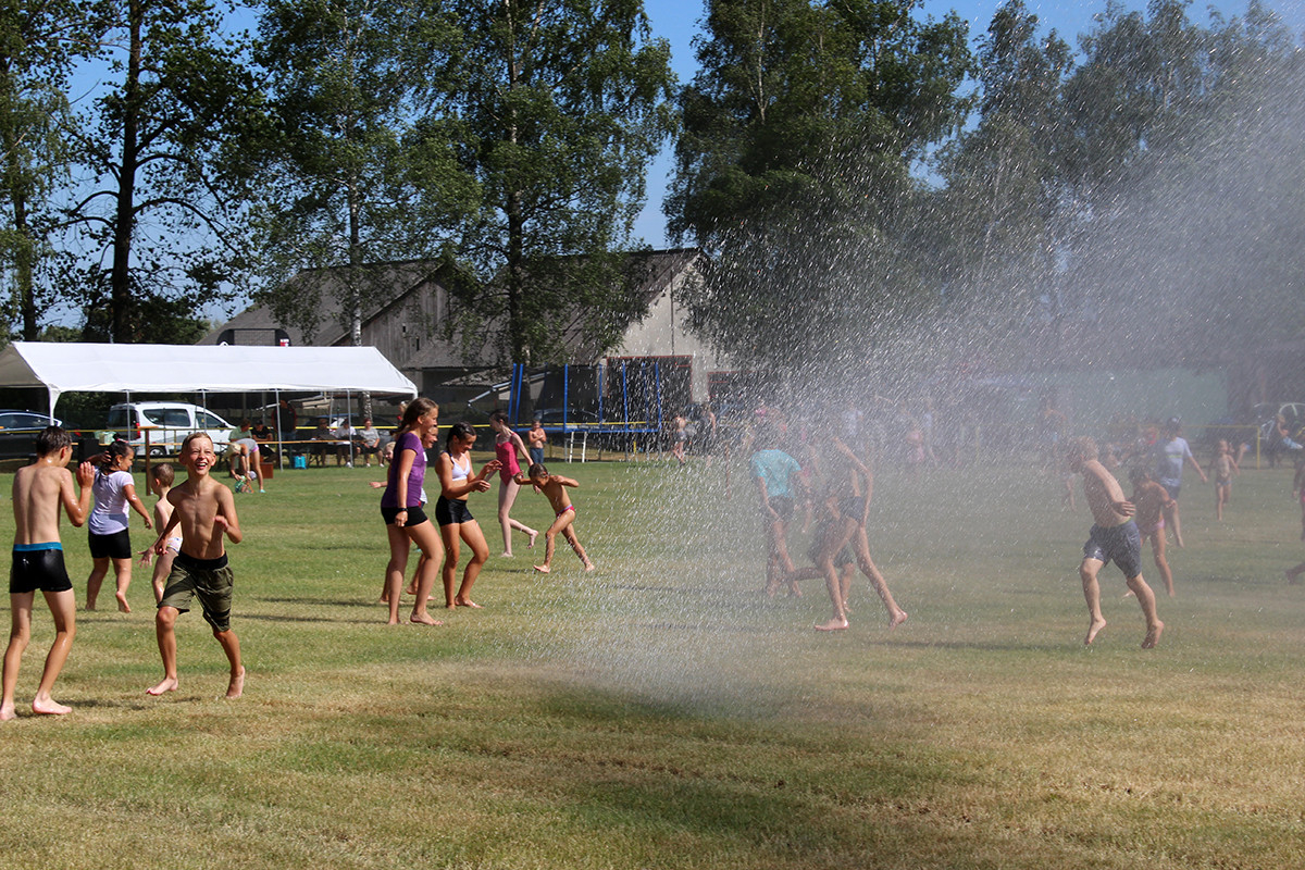 Po výletě z lesa se trochu ochladily nanukem, kdo chtěl, mohl si dát klobásu či točenou limču. A pak došlo na vyhlašování sportovních disciplín. Všechny děti dostaly balíček s překvapením a každé ještě dostalo medaili za účast. A protože horko bylo veliké, hasiči připravili cisternu a děti pěkně pokropili. To je asi to nejlepší, na co se děti těší. Rodiče už méně, ale co by pro své ratolesti neudělali ????. Během celého odpoledne si mohly děti zařádit v nafukovacím hradu či na trampolíně, což také plně využívaly.