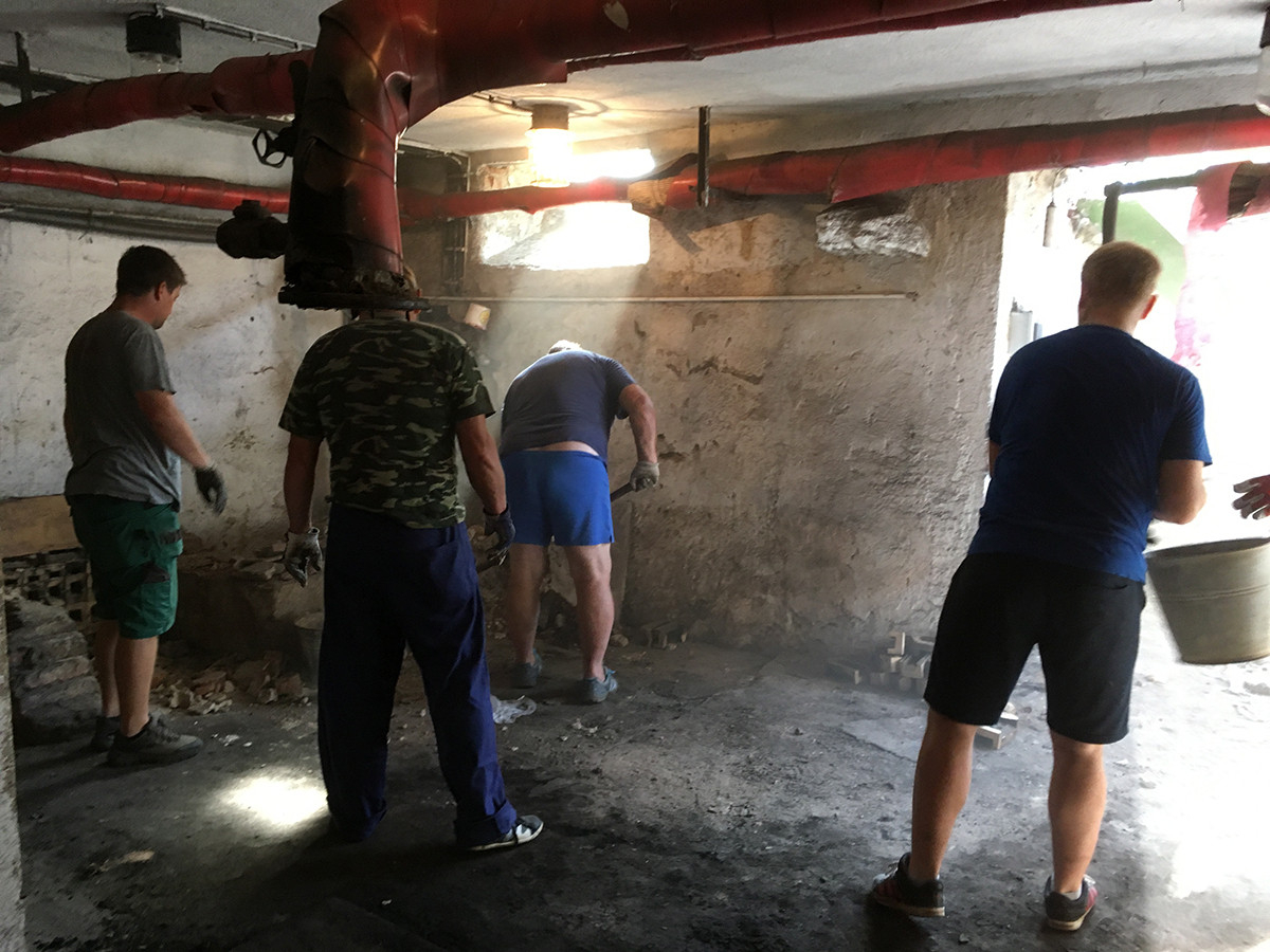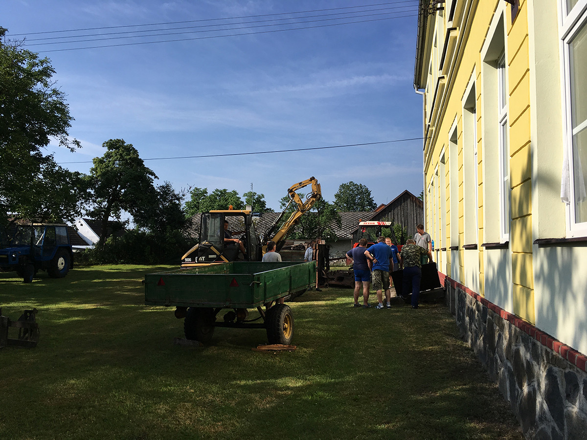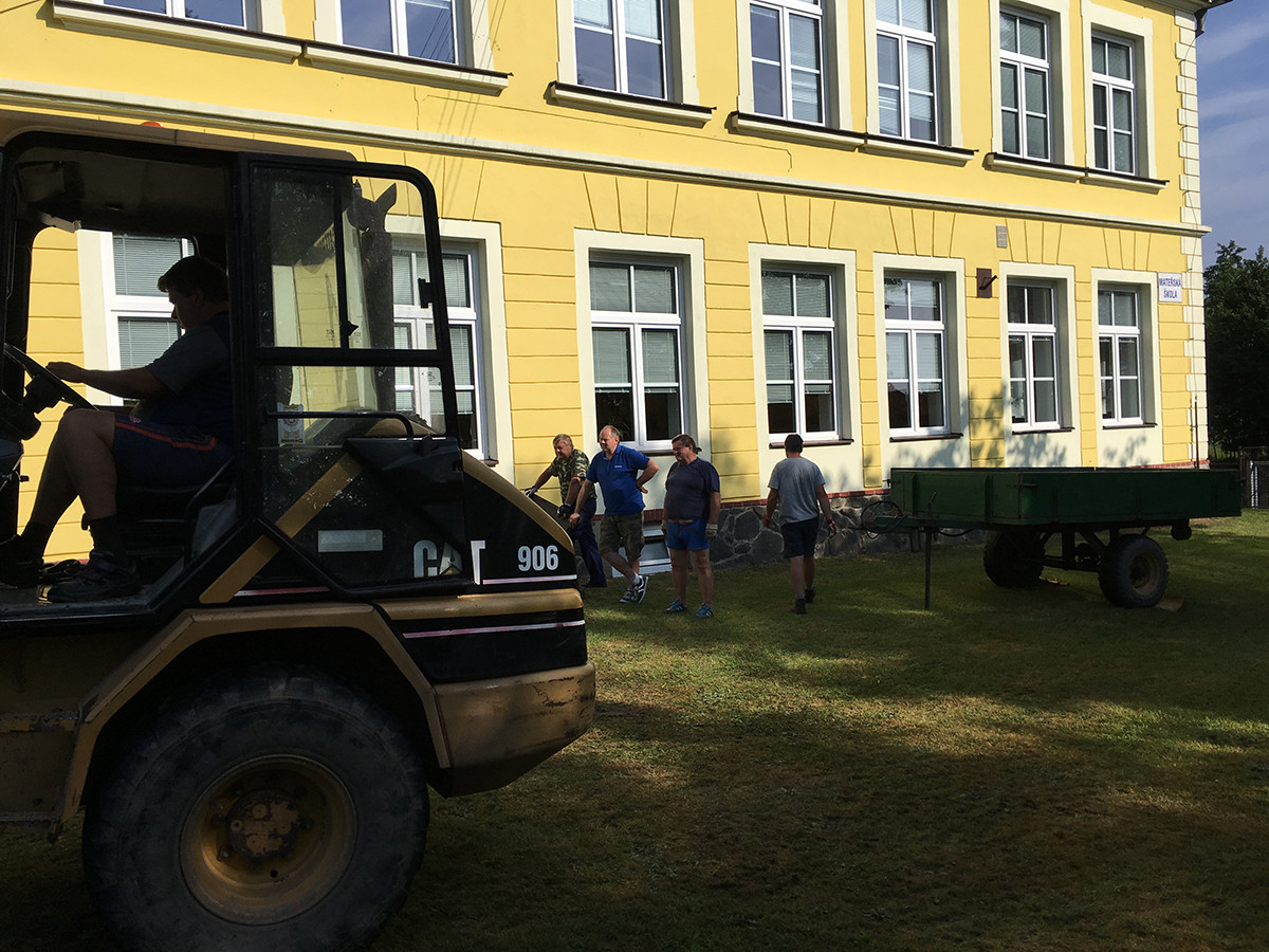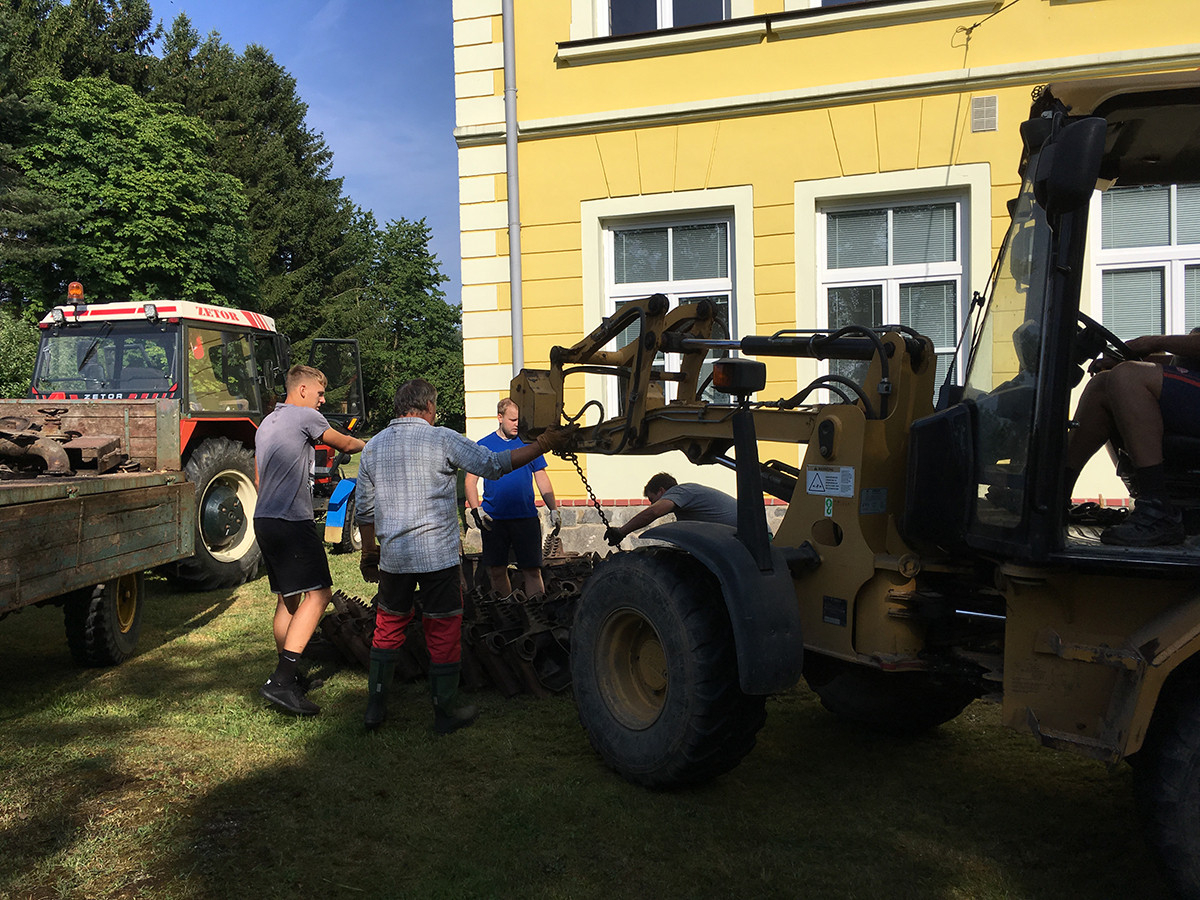 V sobotu 20.7.2019 se hasiči sešli v osm hodin před školkou a začali s vynášením starých kotlů ze školky. Kotle demontovala firma pana Matějky z Volyně, která bude provádět kompletní výměnu zdroje vytápění. Díly kotlů byly postupně pomocí nakladače a šikovných hasičů vyzvednuty ze sklepa a naloženy na valník. Po odstranění všech železných a litinových částí kotlů a rozvodů z kotelny, přišla na řadu i suť z komínů a sklepů. Hasiči vyklízecí práce zvládli za dopoledne a odpoledne poseděli u občerstvení a za odvedenou práci se tak odměnili.