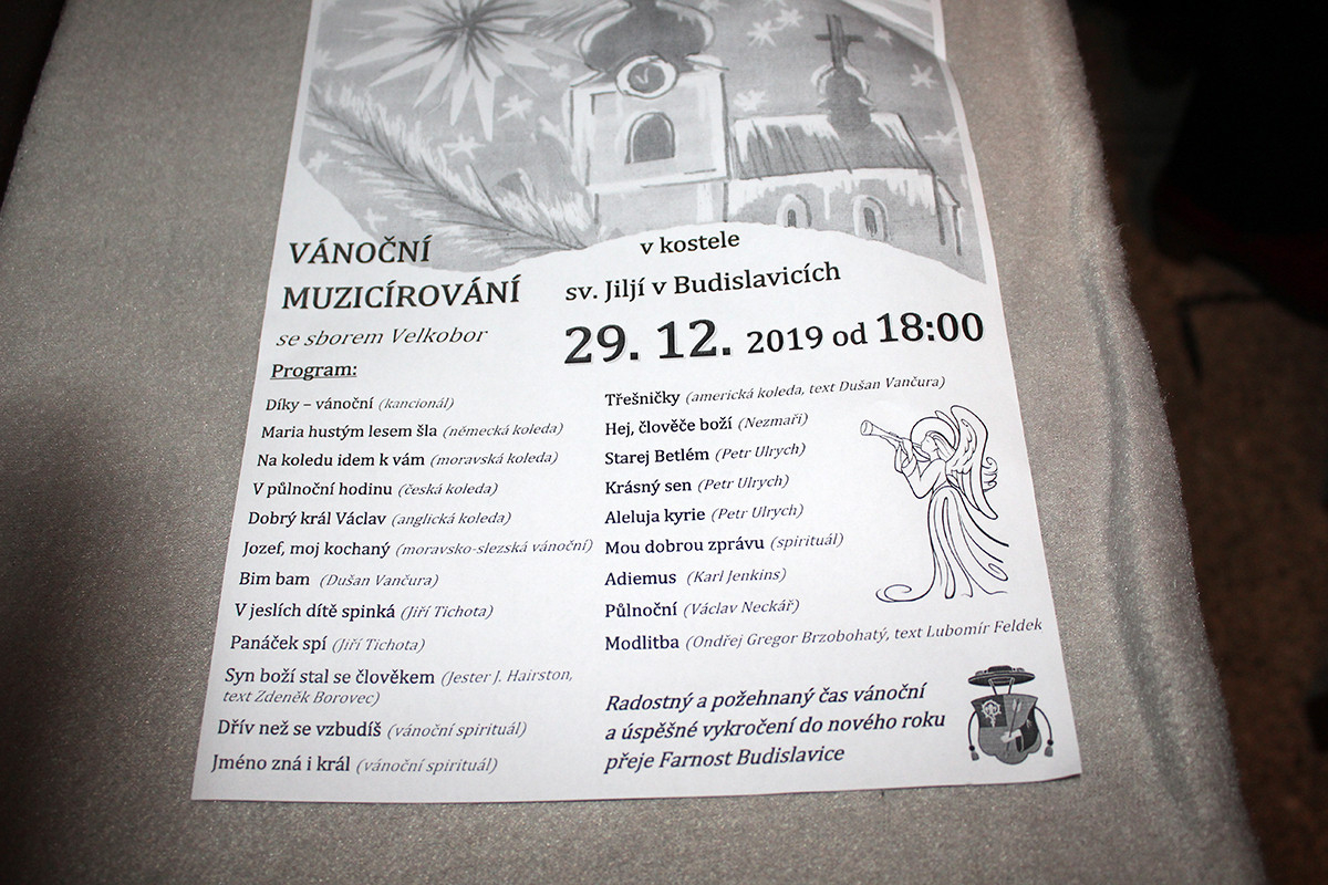 V neděli 29. prosince se od 18 hodin konala tradiční událost Vánoční muzicírování. Tentokrát si všichni lidé poslechli koledy v podání smíšeného pěveckého a chrámového sboru Velkoboru, který v Budislavicích zpříjemnil vánoční čas návštěvníkům již po třetí.