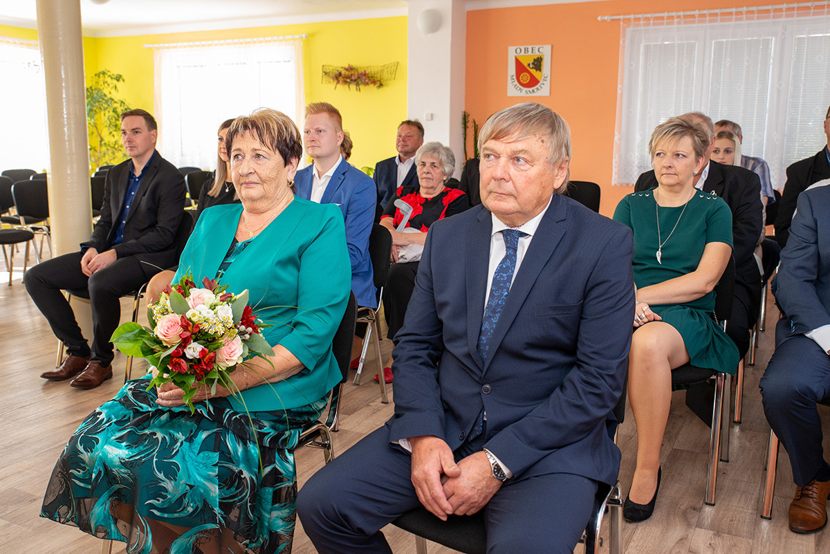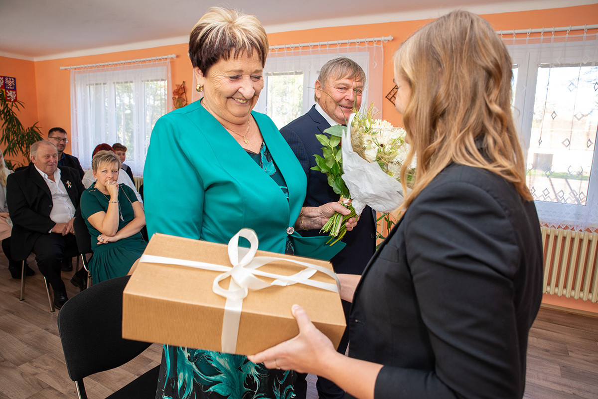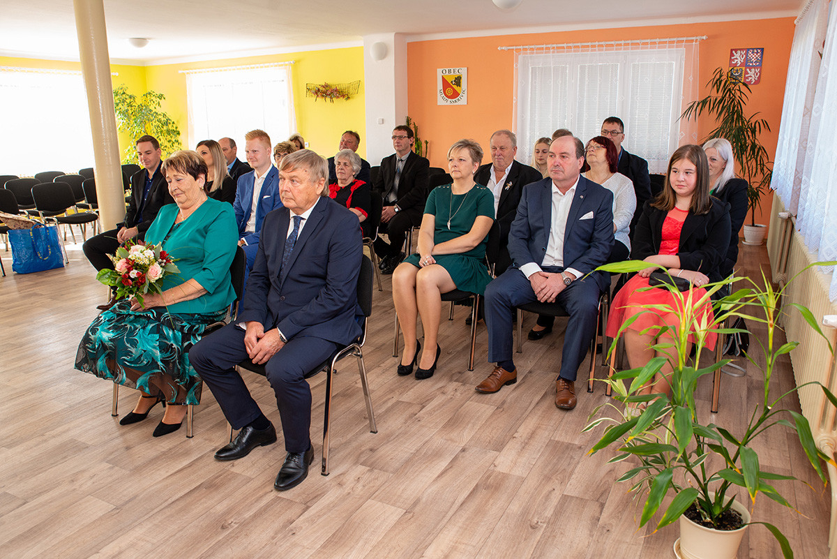 V sobotu 26. 10. 2019 jsme měli tu čest „prodloužit“ jejich manželství u nás v zasedací místnosti. Ve dvanáct hodin místního času dorazilo asi třicet svatebních hostů, aby spolu s Panuškovými oslavili zlatou svatbu. Alenka Kovaříková nejprve všechny přivítala a představila nám „zlatomanžele“. Po kratičkém shrnutí jejich společného života si manželé řekli své ano, vyměnili si prstýnky a svůj slib stvrdili manželským políbením. Došlo i na focení, kterého se ujal Vašek Blovský. Po svatebním obřadu se odebrali na zlatou svatební hostinu do přízemí úřadu, do bývalé hospody. Připomněli si tak vzácnou událost, kterou prožili 25. 10. 1969 na kasejovické radnici. Tam si tenkrát řekli své ano v jedenáct hodin a pak vyrazili na svatební hostinu domů do Starého Smolivce. Paní Anna se narodila ve Starém Smolivci, kde vyrůstala se třemi sourozenci. Pan Vladimír je rodák z Mladého Smolivce a za svou manželkou se přestěhoval do sousední vsi. Pracoval jako opravář zemědělských strojů v zemědělském podniku v Kasejovicích a poté pracoval v KOVU v Kasejovicích. Jeho největším koníčkem byl a stále je fotbal, starost o dům, zahrádku a domácí zvířectvo. Anička pracovala jako kuchařka nejprve v Nových Mitrovicích a pak v zemědělském podniku v Kasejovicích. Dodnes se svou sestrou pomáhá na různých akcích, kde svůj kuchařský um stále může uplatňovat. Společně s manželem vychovali dceru a radost jim dělají dnes již dospělí vnuci Ota a Honza.