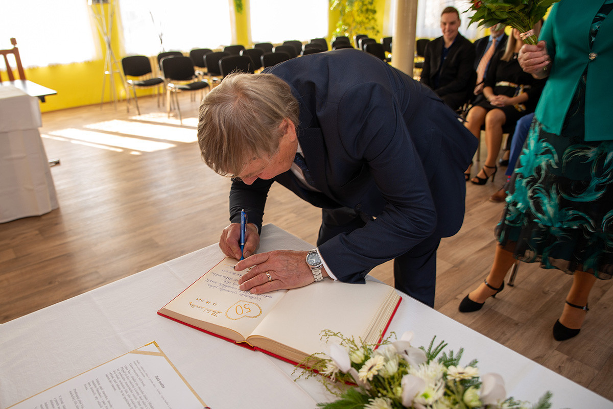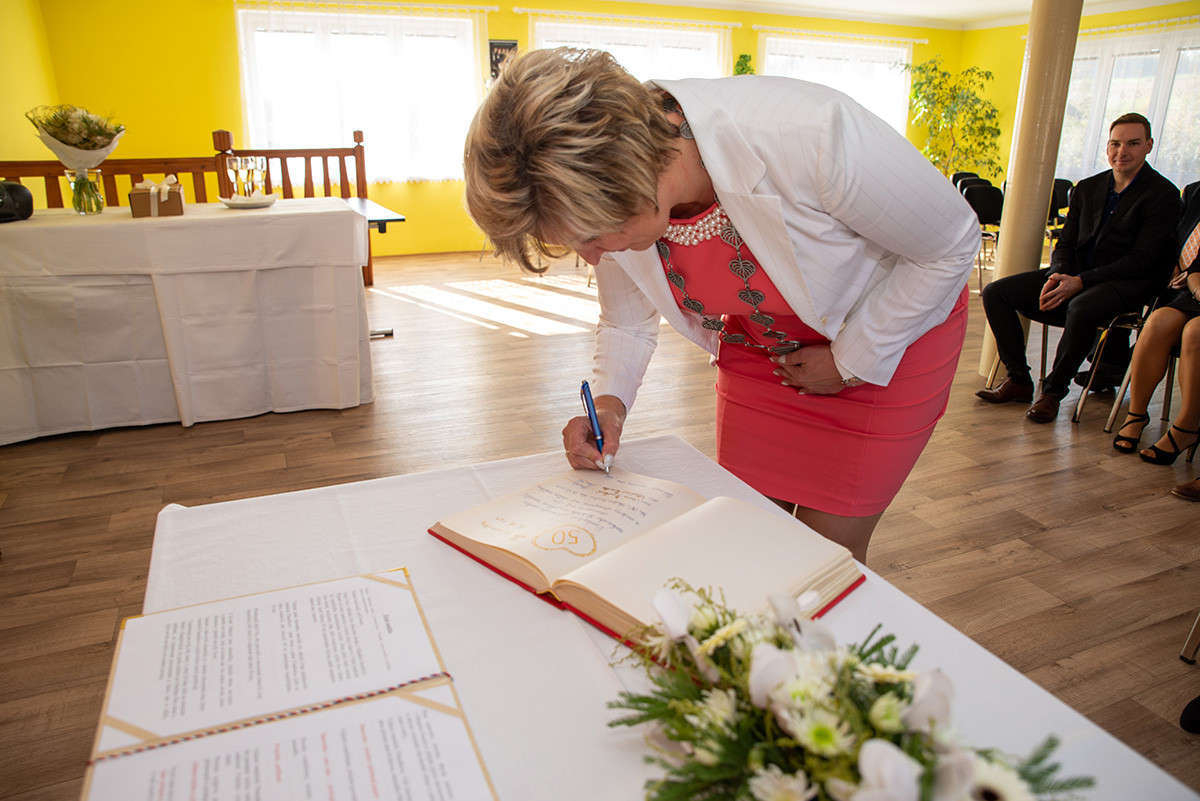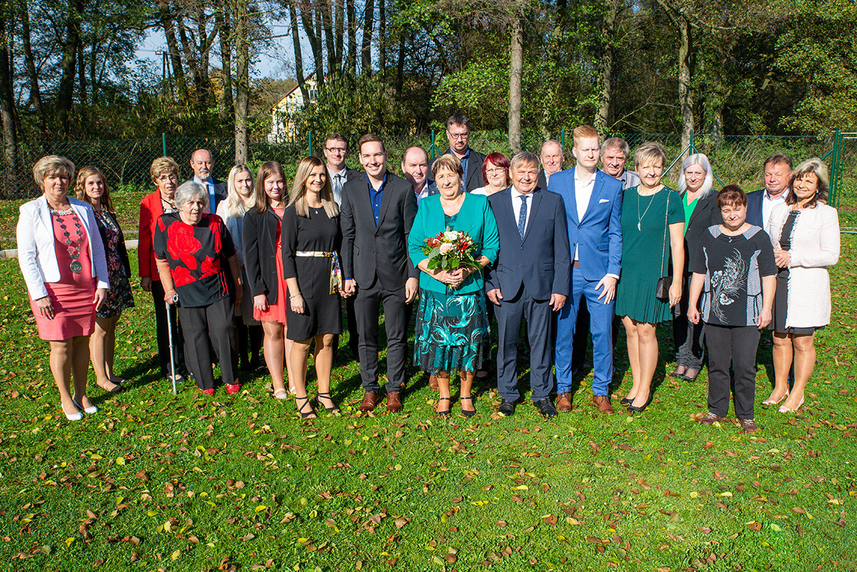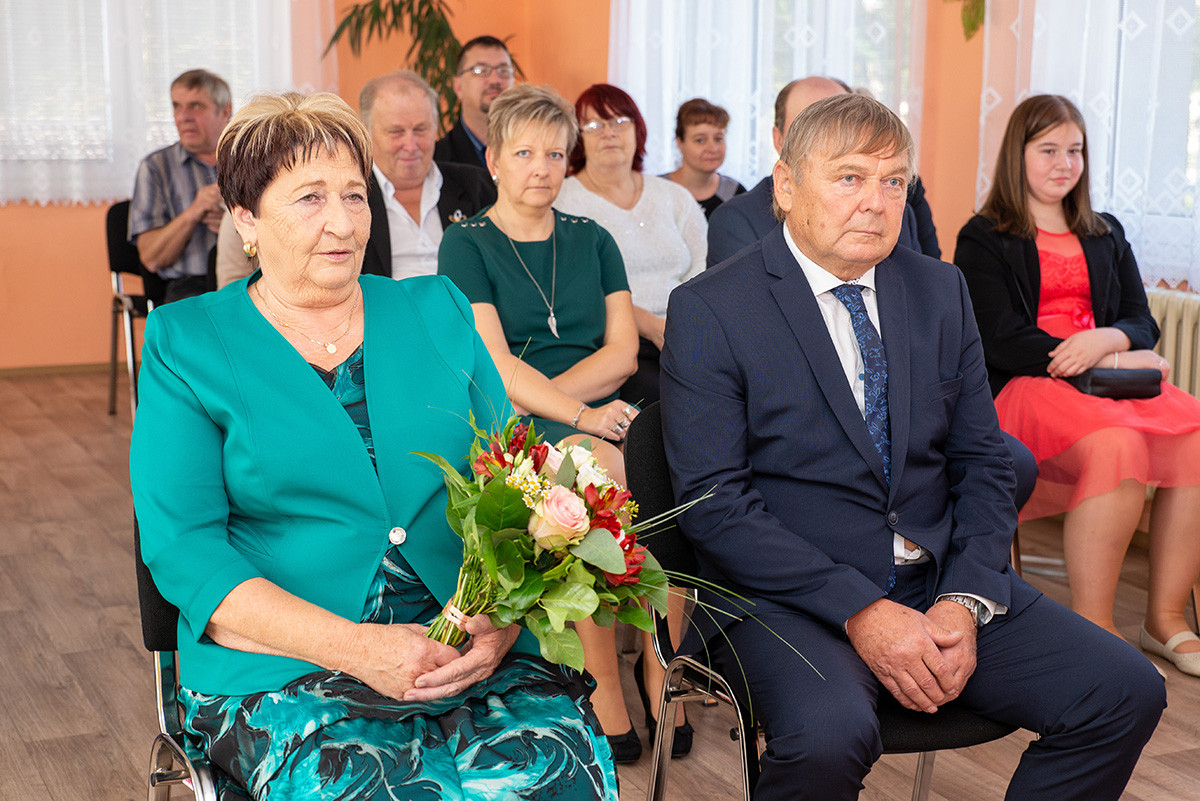 V sobotu 26. 10. 2019 jsme měli tu čest „prodloužit“ jejich manželství u nás v zasedací místnosti. Ve dvanáct hodin místního času dorazilo asi třicet svatebních hostů, aby spolu s Panuškovými oslavili zlatou svatbu. Alenka Kovaříková nejprve všechny přivítala a představila nám „zlatomanžele“. Po kratičkém shrnutí jejich společného života si manželé řekli své ano, vyměnili si prstýnky a svůj slib stvrdili manželským políbením. Došlo i na focení, kterého se ujal Vašek Blovský. Po svatebním obřadu se odebrali na zlatou svatební hostinu do přízemí úřadu, do bývalé hospody. Připomněli si tak vzácnou událost, kterou prožili 25. 10. 1969 na kasejovické radnici. Tam si tenkrát řekli své ano v jedenáct hodin a pak vyrazili na svatební hostinu domů do Starého Smolivce. Paní Anna se narodila ve Starém Smolivci, kde vyrůstala se třemi sourozenci. Pan Vladimír je rodák z Mladého Smolivce a za svou manželkou se přestěhoval do sousední vsi. Pracoval jako opravář zemědělských strojů v zemědělském podniku v Kasejovicích a poté pracoval v KOVU v Kasejovicích. Jeho největším koníčkem byl a stále je fotbal, starost o dům, zahrádku a domácí zvířectvo. Anička pracovala jako kuchařka nejprve v Nových Mitrovicích a pak v zemědělském podniku v Kasejovicích. Dodnes se svou sestrou pomáhá na různých akcích, kde svůj kuchařský um stále může uplatňovat. Společně s manželem vychovali dceru a radost jim dělají dnes již dospělí vnuci Ota a Honza.