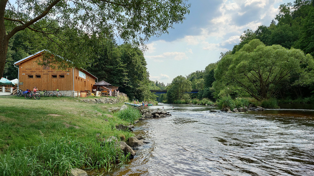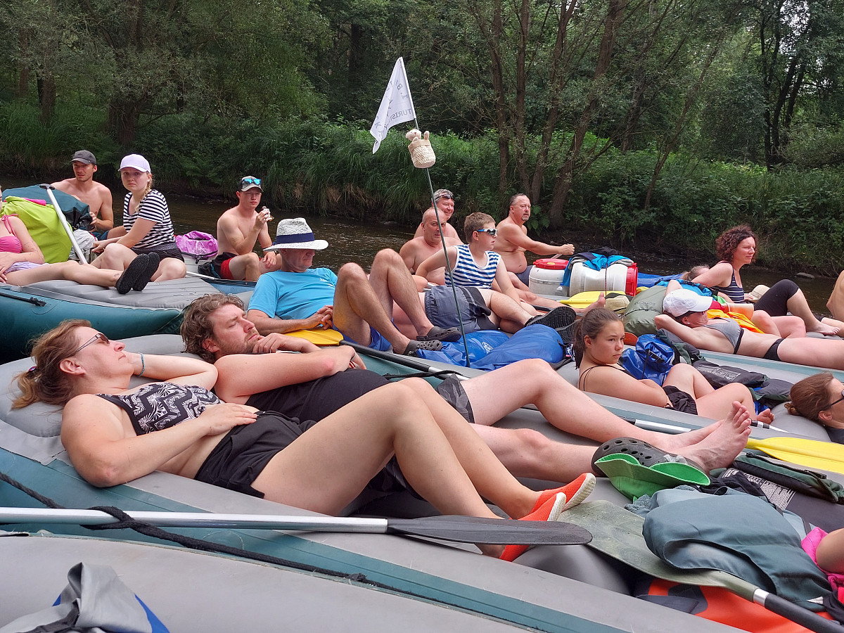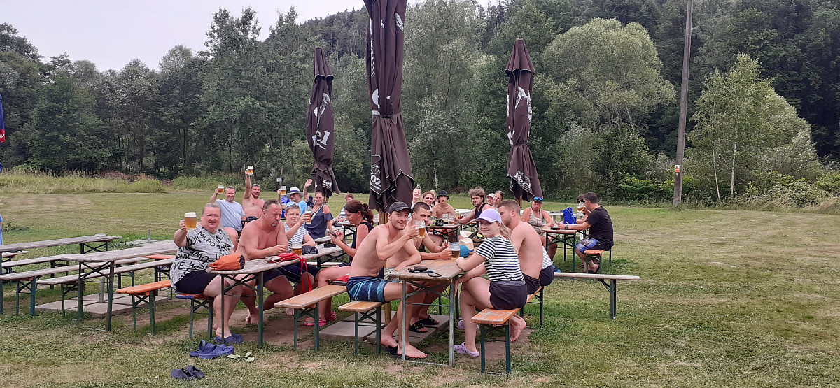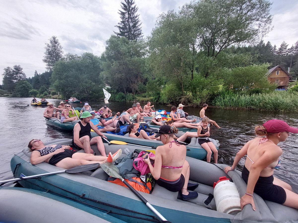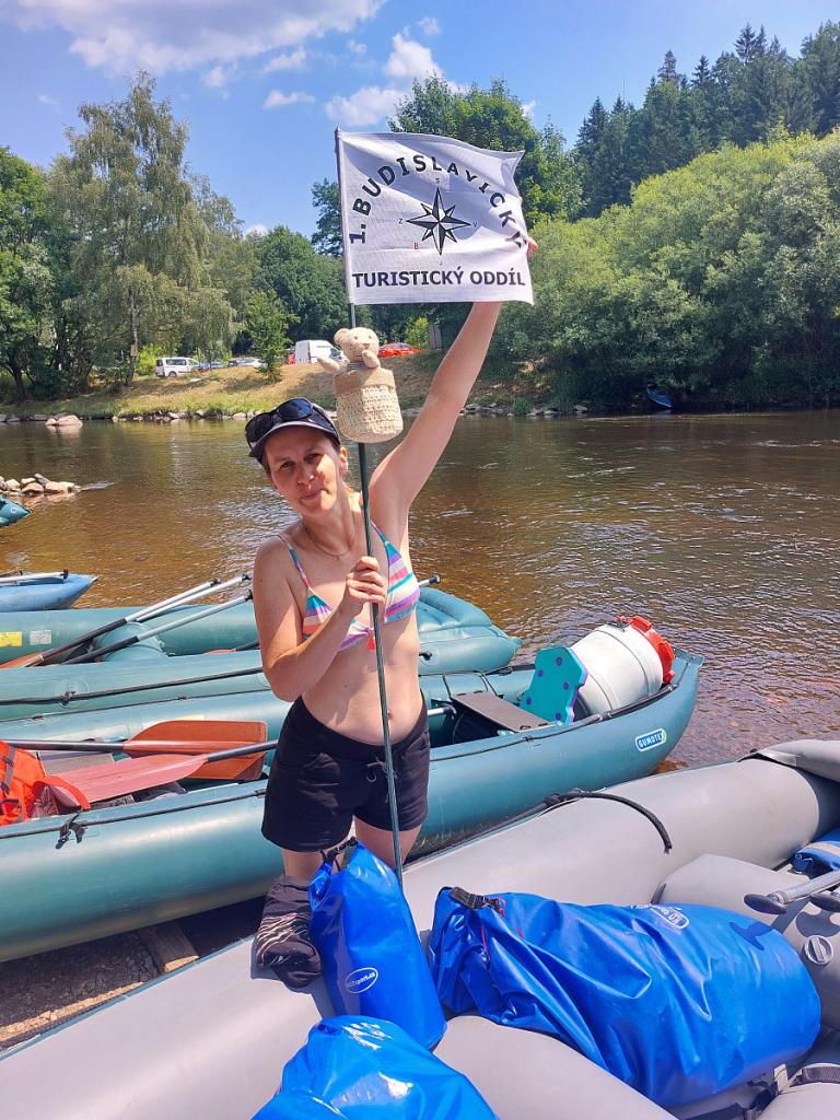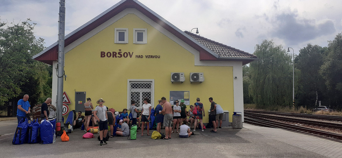 Léto na sebe nenechalo dlouho čekat a 9. 7. 2023 se po šesté hodině ranní sešlo na nádraží ve Dvorci u Nepomuku celkem 32 vodáků (později ještě dva přibyli). Hromadná jízdenka do vlaku byla koupená a tak nic v 6:31 nebránilo našemu odjezdu. S rychlými přestupy v Českých Budějovicích a Rybníku jsme před polednem vystupovali ve Vyšším Brodě. Zde jsme si přebrali z půjčovny rafty s příslušenstvím a vypluli za dobrodružstvím. Na raftu Ládi Nového samozřejmě nechyběla vlaječka I. BTO.