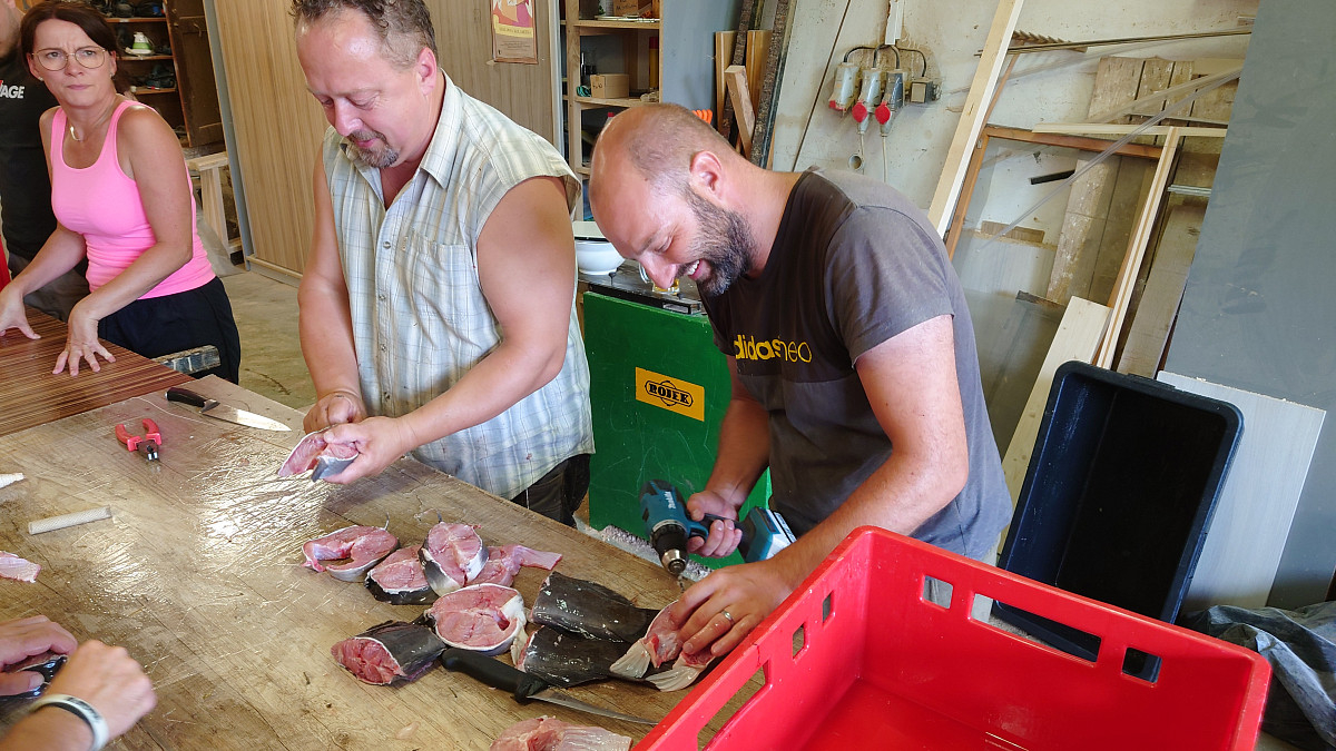 Musím podotknout, že z každého ročníku se pořadatelé snaží poučit a zakomponovat do akce poznatky z ročníku proběhlého, aby se v Budislavicích návštěvníci cítili dobře a služby jim poskytované se rovněž zkvalitňovaly. Letošní Rybí slavnosti podpořila rovněž Obec Mladý Smolivec zapůjčením materiálu pro technické zázemí, tak jako v minulých létech a novinkou bylo zapůjčení toalet, které byly pro přítomné nachystány na návsi, aby se navýšila kapacita. Tímto Obci Mladý Smolivec děkujeme za podporu a věříme, že naši akci podpoří i v létech následujících. Další novinkou bylo postavení více stanů, i když již ve vzdálenějším okolí., ale nakonec si návštěvníci poradili sami a připravené stoly a lavice si přesouvali dle své potřeby. Každopádně sobotní ráno bylo pro pořadatele startovní čárou pro celodenní (i celonoční) maratón. Ráno měl každý svůj úkol, kluci stavěli stany, holky připravovaly dobroty, chystaly květinovou výzdobu a probíhala příprava prodejních stánků. Pochutiny byly vyrobené od pátku a na jídelníčku letošních slavností bylo devět rybích pochoutek, které doplnily grilované hermelíny a klobásky přímo z udírny, takže nabídka velmi bohatá. Návštěvníci začali do připraveného areálu proudit již kolem 15 hodiny, i když začátek akce byl až v 17 hodin, kdy začala vyhrávat Malá muzika Nauše Pepíka, která akci provázela až do 23 hodin. Každý kdo se usadil ke stolu, ihned dostal na stůl tácek se sladkostmi, které připravila místní děvčata. Ihned po otevření všech výdejních okýnek si začali zákazníci nakupovat již zmiňované pochutiny, a protože i zde došlo k jistým inovacím, tak fronta rychle mizela. Kolem 17 hodiny došlo k vyhlášení odpoledních rybářských závodů, které probíhali na místním rybníčku a děti byly odměněny. Vítězem se stal Jakub Valenta. Čas velice rychle plynul, návštěvníci se bavili, tančili, ochutnávali a najednou zde byl večer a kapelou vyhlášená poslední série. Zúčastnění se začali rozcházet do svých domovů a pátý ročník rybích slavností byl ten tam. Nedělní dopoledne bylo ve znamení úklidu a kolem poledne to v Budislavicích vypadalo, jako by se zde vůbec nic nedělo.