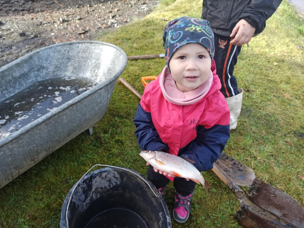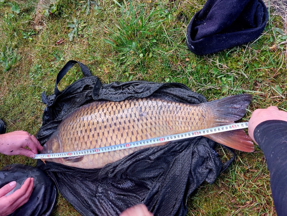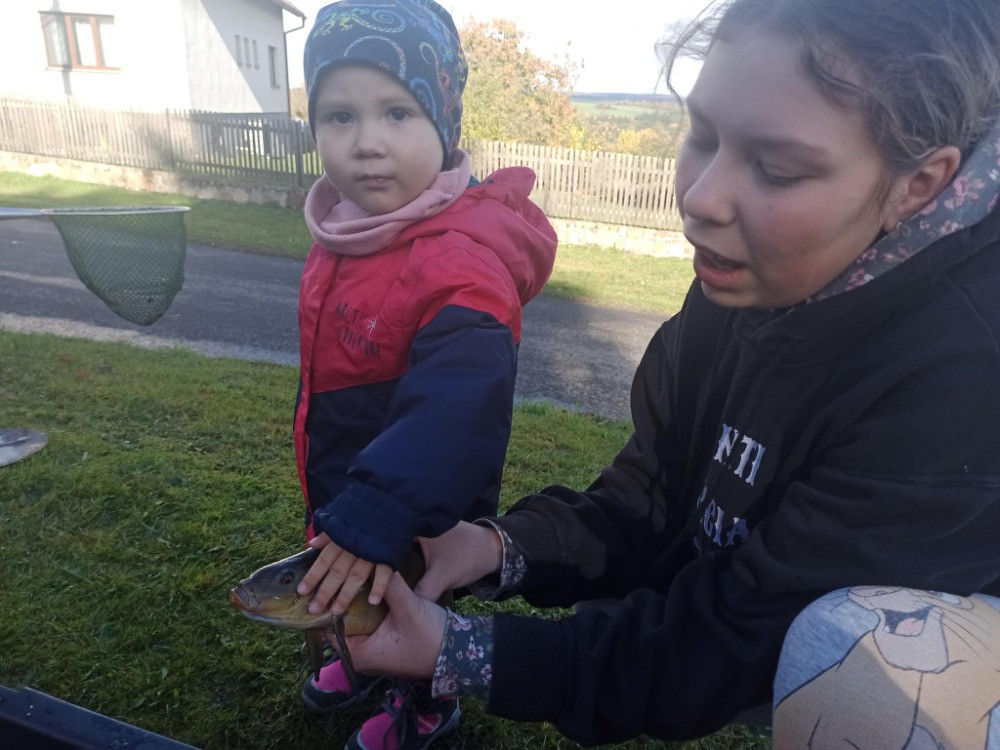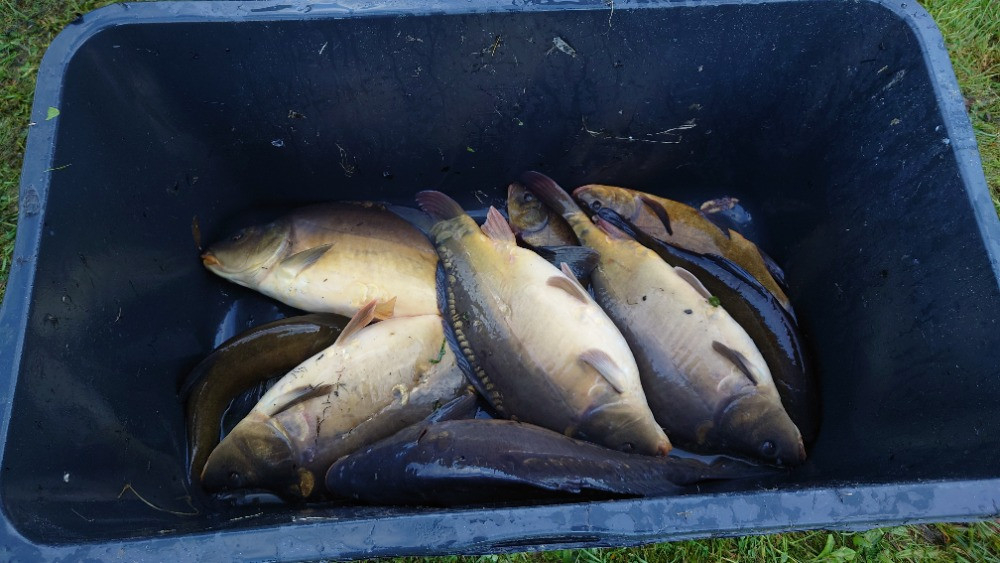 Po obědě bylo dílo dokonáno a na břeh se podívalo kolem 60 ks kapra, dva amuři, 10 línů a další ryby jako okouni, plotice a perlíni v různých velikostech. Hlavní atrakcí se stal tradičně kapr Štěpán s váhou 7,5 kg a délkou 75 cm. Byl očekáván vyšší počet kaprů, ale bohužel stejně jako všude, i my se nejspíše potýkáme s nevítanými návštěvami vyder v průběhu roku a zejména zimy, což bylo evidentní z počtu přeživších kaprů vrácených loni.