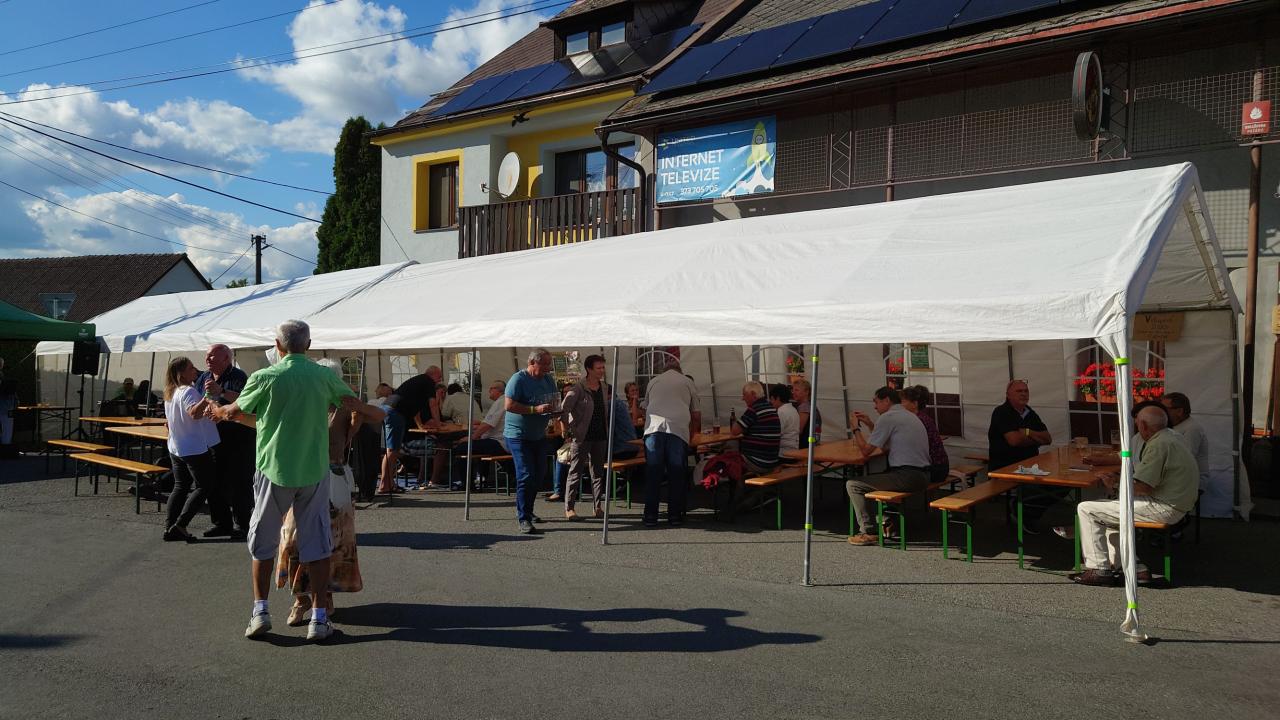 Noční déšť spláchl prach a sobotní ráno nás vítalo slunečnou oblohou, která vydržela přes celou pouť. Dopoledne se postavily stany, rozložily stoly a lavice, připravil gril a připravilo se vše na to, aby za zvuků heligonek Aleše Rusňáka mohly ve 14 hodin padnout první výstřely na střelnici a z grilu se mohla linout příjemná vůně grilovaných hermelínů, klobás a smažených bramborových hranolek. Při stavění stanů jsem si mimoděk vzpomněl na dávnou dobu, kdy jsem byl na základní vojenské službě. Tenkrát, když bylo třeba něco udělat, a byli na to třeba jen dva vojáci, jeden byl vždy určen jako velitel a práci řídil a říkal, co kdo má dělat. Stavění stanů, jelikož u něj nebyl ten, který nás většinou "koordinuje" vypadalo přesně opačně, než jak jsem vzpomínal na vojnu. Tady to řídili a veleli všichni :-) a tak jsme po několika chybných pokusech při stavbě prvního stanu, kdy jsme tu a tam prohodili tyče konstrukce nakonec druhý stan postavili již bez větších potíží. Heligonky Aleše Rusňáka přestaly hrát ve 20 hodin, ale to rozhodně neznamenalo, že tím končilo pouťové veselí. V hraní k tanci, poslechu a zábavě pokračoval Josef Tureček. Letos nám přibyla jedna atrakce a to Jízda na labutích. Tato atrakce je na poutích poměrně známá, však v pojetí, které bylo u nás, si troufám říct, že ji neuvidíte a nezažijete nikde jinde na světě. Monika se Zuzkou by si jistě nepřály, abych prozradil, že to byl (jako jindy spousta jiných dobrých a veselých nápadů) jejich nápad, tak jejich přání budu respektovat a napíši pouze, "jízdu na labutích" vymyslela dvě děvčata. Pan Tureček hrál a my se bavili i přes půlnoc a poslední z nás tak při cestě domů mohli vidět na hodinách na věži kostela dvě hodiny.
